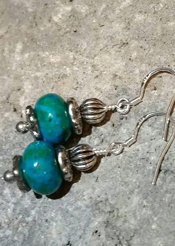 This beautiful natural Chrysocolla gemstone has a vivid blue-green color. Topped with antique silver bead caps and dangle from sterling silver ear hooks. These lightweight earrings are the perfect finish to a vintage or bohemian look. www.jewelrybyginamonique.etsy.com https://www.etsy.com/listing/586209824/chrysocolla-earrings-blue-green-dangle?ref=related-8