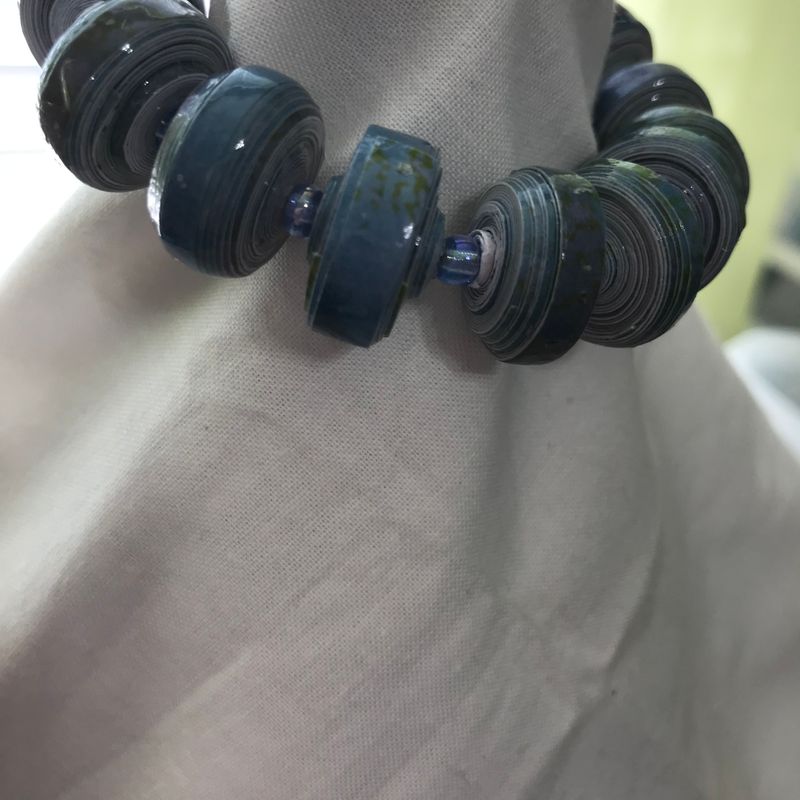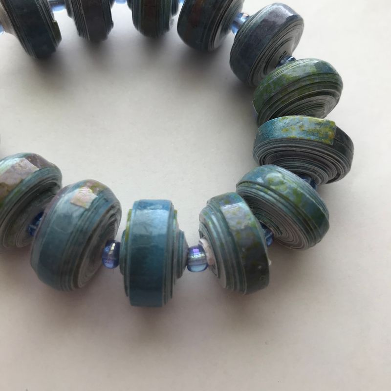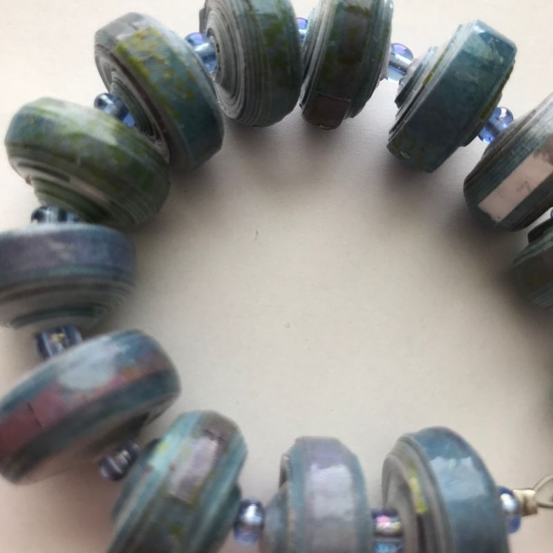This beautiful paperbead bracelet is 6 1/2 inches long. Made out of watercolor paper , it’s blue with traces of green throughout. This piece has no limits on what and where it can be worn. It’s truly a piece to be noticed,