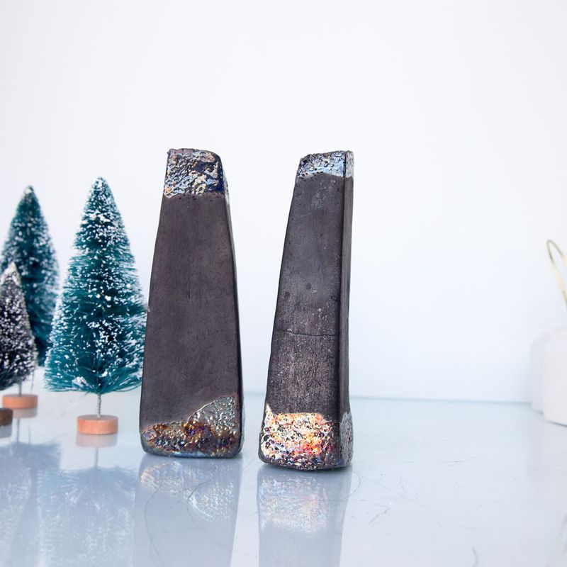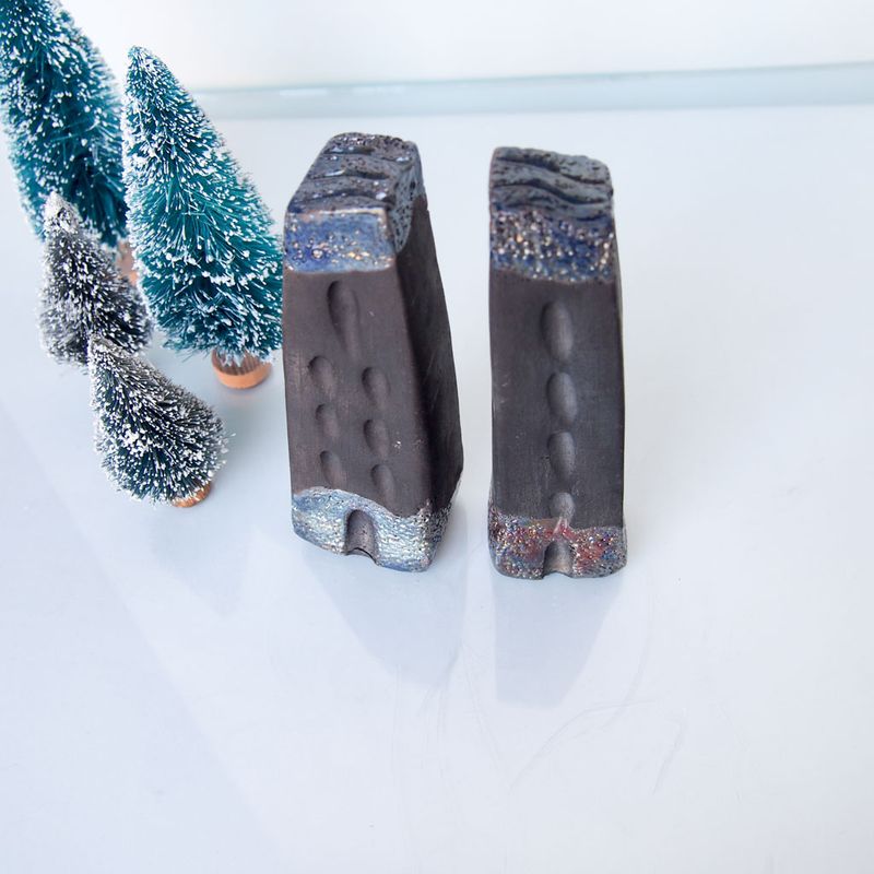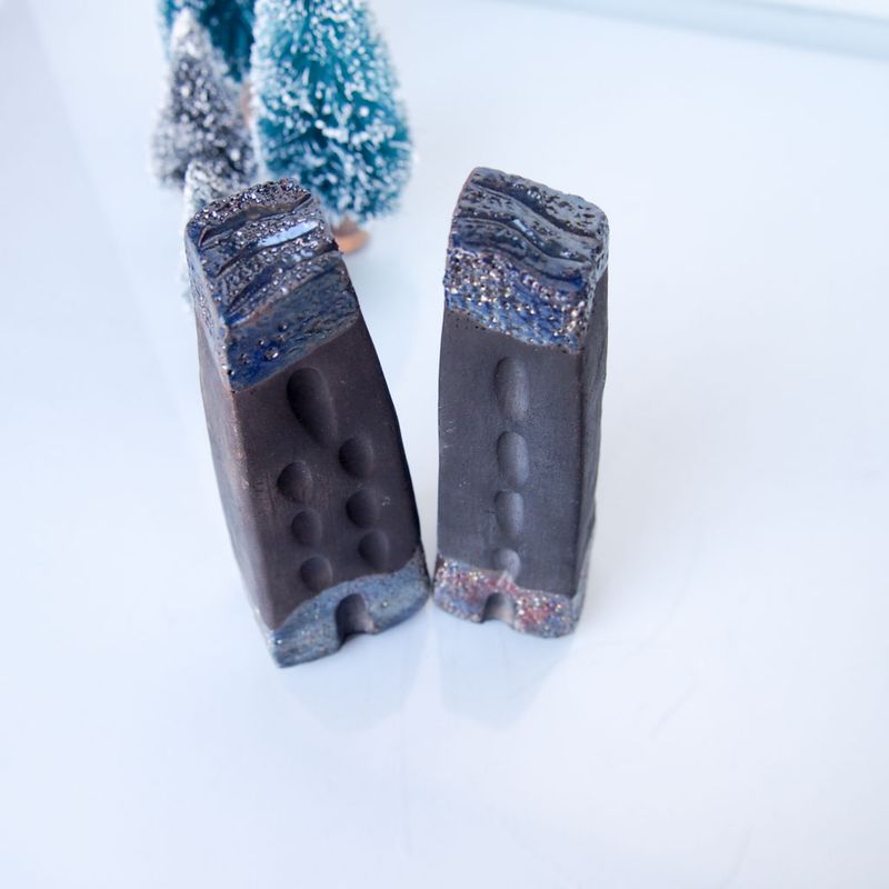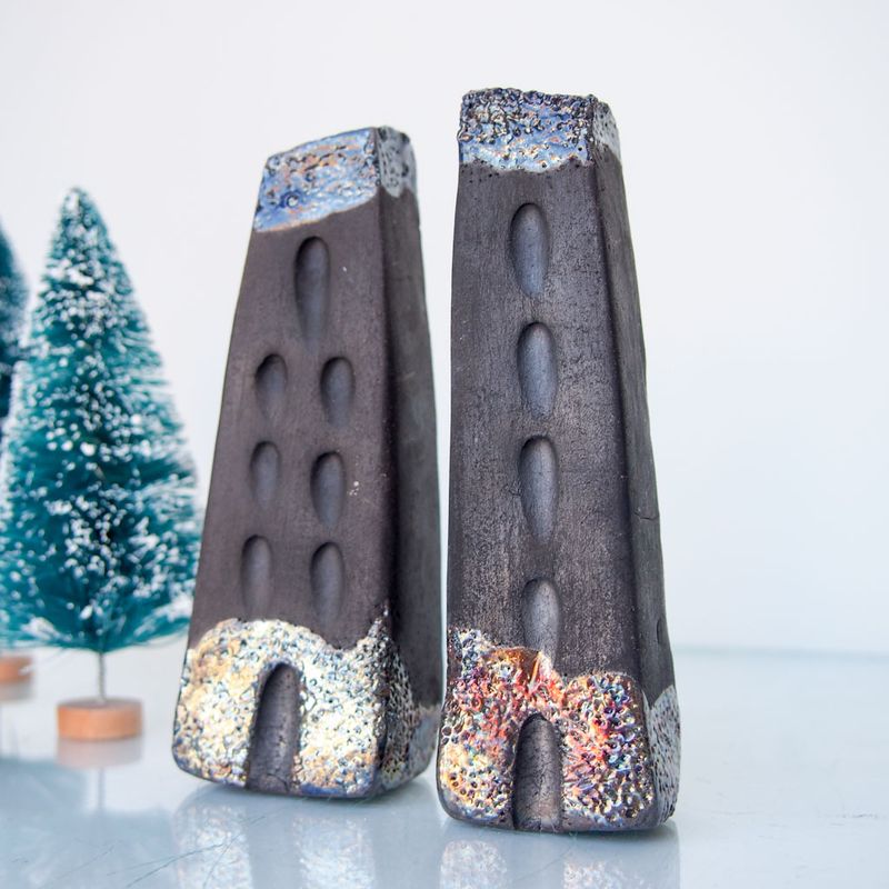 Set of 2 Art Raku pottery fired black Ceramic houses with copper/gold details. Hand sculputed houses with beautiful colours which changes with lights on them are perfect for a little nook of the house. Raku glazes contain a lot of copper that gives the fired pieces beautiful green, silver, and gold shades. Hand sculpted and raku or earthenware fired. Hand sculpted houses are perfect for a little nook of the house. It is unique and collectibles. With this listing you will receive two (2) houses. Dimensions aprox: 12cmx3cm