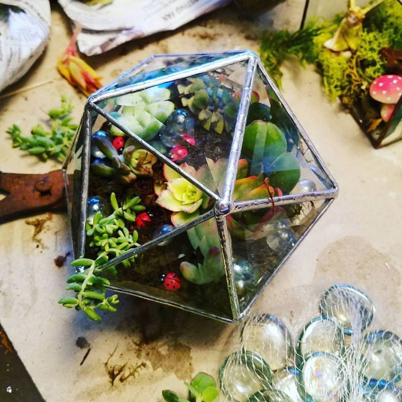 This is a one of a kind creation of mine. I take several triangle bevels and make them into a water tight sphere with one triangular opening. I use glass balls and moss to fill the sphere part way and plant and decorate it with live succulents and various miniatures. This a best seller! Catches the eye of everyone who walks by at an art show! When shipped everything comes with it but it must be assembled by you. if customer pick up I can do it for you!