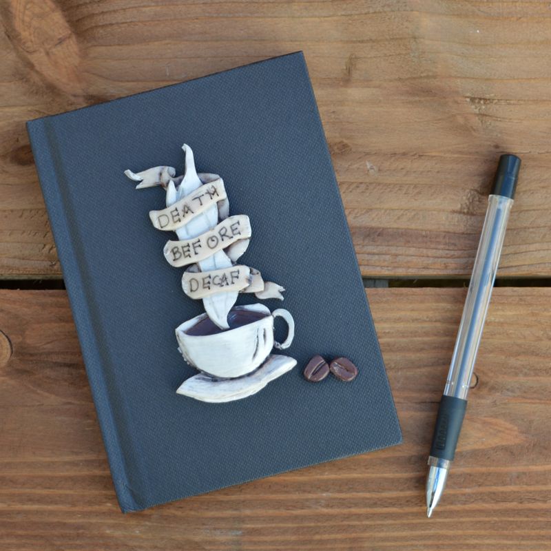This coffee notebook makes the perfect gift for anyone who likes coffee, alternative gifts or tattoo art. This coffee notebook has been sculpted by hand and features a coffee cup design with the words "Death before decaf". This black notebook measures 6 inch x 4 inch and is flat backed so is easy to write in. This book also has lined pages. SHIPPING FROM THE UK - Shipping Prices Vary - www.redvesseldesigns.com