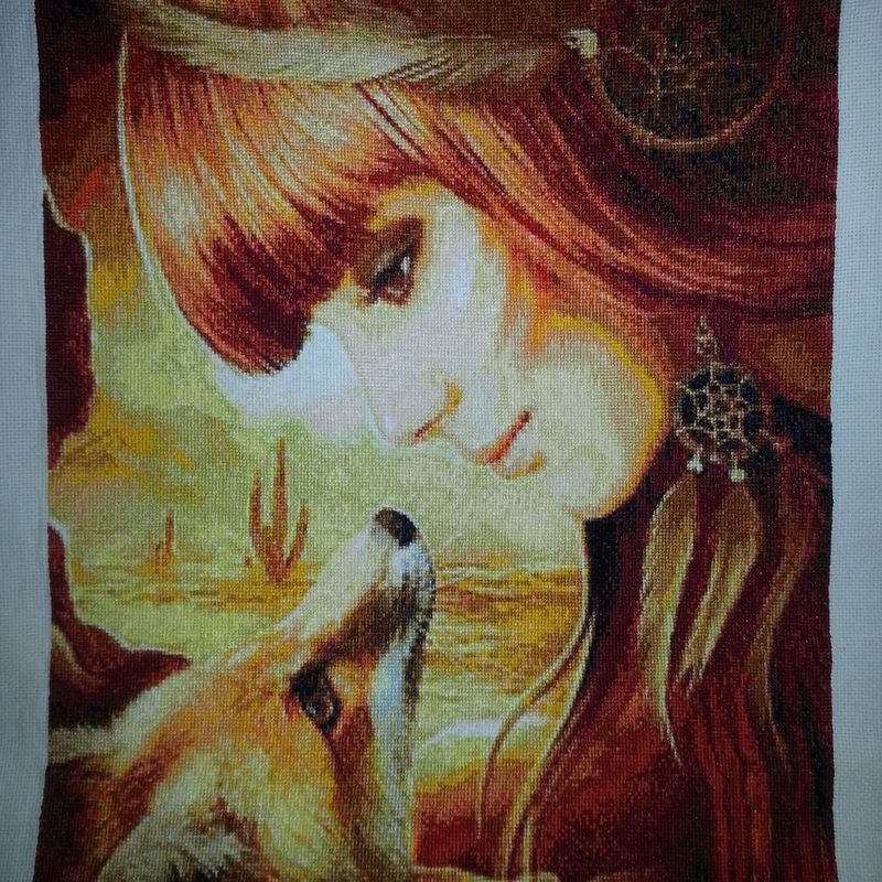 Handmade completed cross stitch of a girl and a fox. I've been working on this for 5 months and I hope to find a buyer who will enjoy this work as much as I enjoyed creating it. This piece is unframed for ease of shipping and so that the buyer can frame it to suit their home. It has been professionally cleaned and is ready for framing. The design was created on 16 count Aida and is 30 cm wide by 40 cm long. The full fabric is a little larger, plenty of extra fabric for framing. Colours: 80 It was made with Madeira threads.
