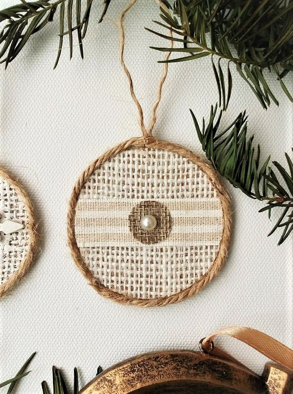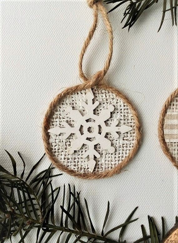 Set of rustic farmhouse style Christmas ornaments made from cardboard, burlap, rope, wooden snowflake, decorative fabric, half plastic pearls, acrylic paint... Great for Christmas tree, fireplace, wreath, staircase or as a finishing touch to any gift package. Dimension 2.3" (5.8 cm) 2.3" (6.0 cm) Completely handmade and hand painted and so cute for the upcoming holidays! Unique.