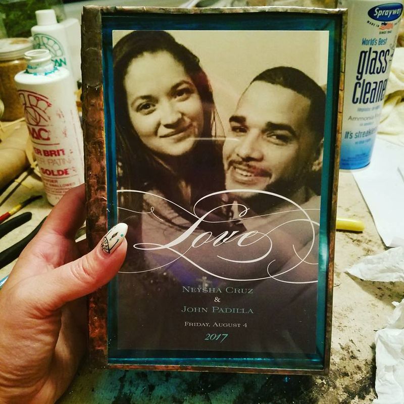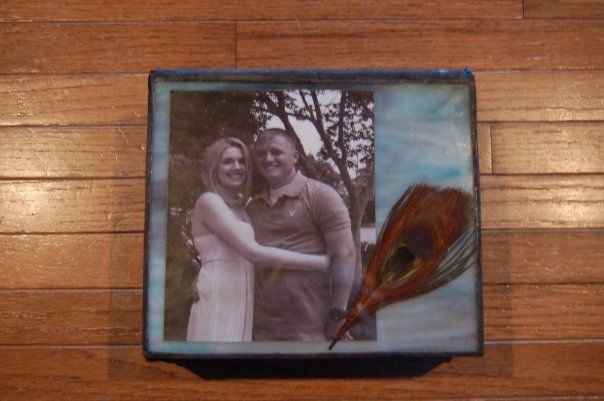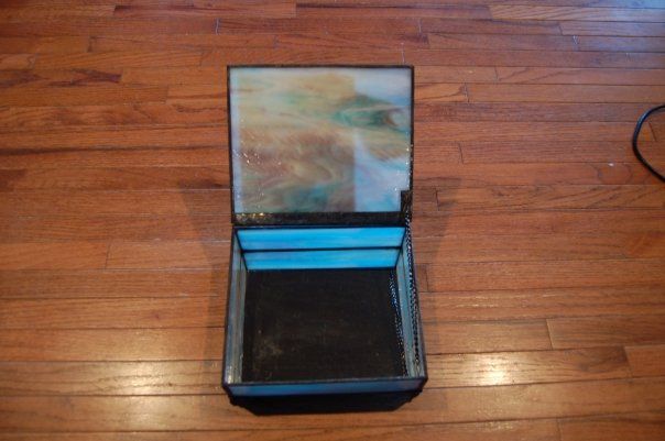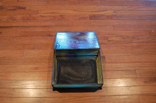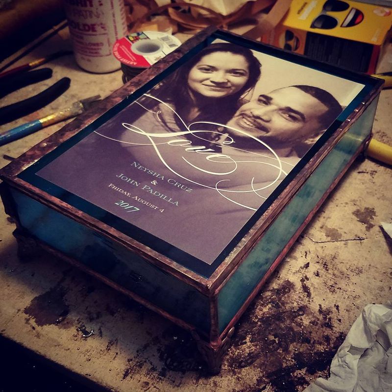 These a custom made boxes. They can be just about any size. You provide me with the invitation and or photos and let me know if there is anything else you would like to incorporate. You also choose the coloration. The lid is sandwiched glass. The box is made also made of glass. They are made with Mirrored Bottoms. They are also equipped with Metal feet and a chain inside the lid. These make absolutely stunning wedding gifts! I have even had couples commission me to make them for themselves for keepsakes to hold small things they loved from their weddings. I'm sure I can make your dream box!