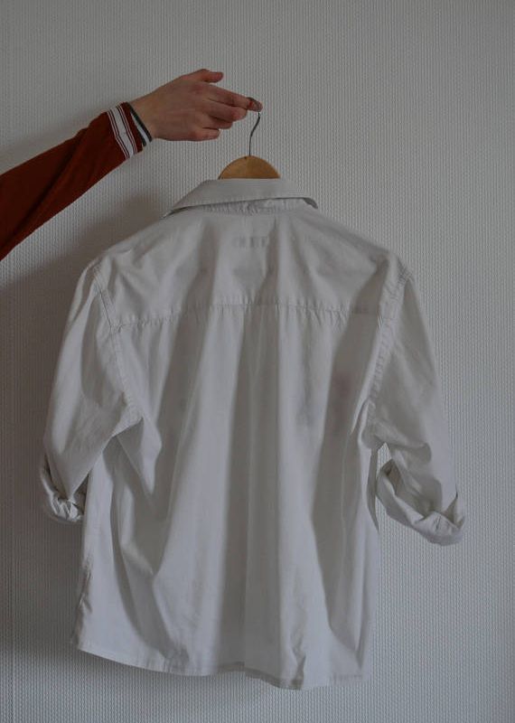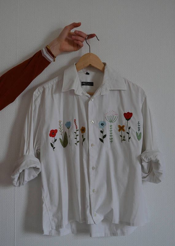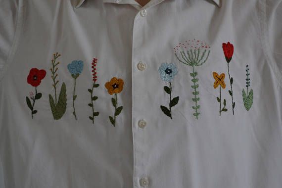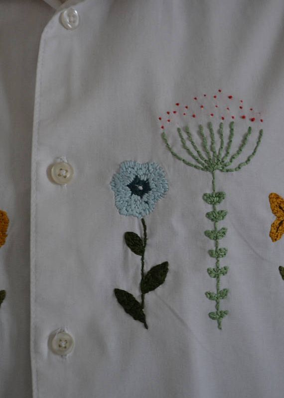 A white shirt with a line of little flowers. It's a unique shirt