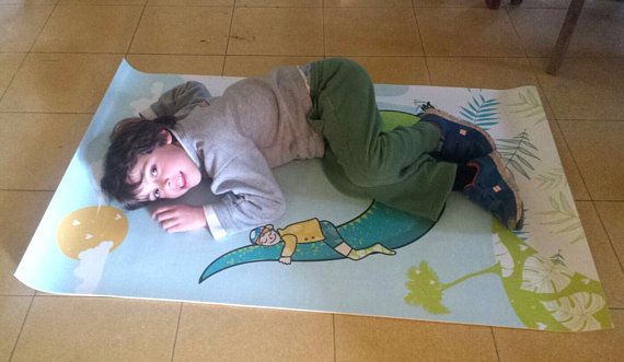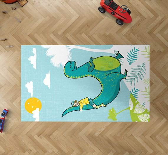 An original illustration made by Reni. Beautiful illustration printed on a PVC rug of a boy ridding on a cute dinosaur tail. perfect for your nursery or kids room. Will be a great idea for a newborn or a toddler present. This rug is made from a quality PVC, pleasant to touch, easy to clean... It fits every surface and sticks to the floor and doesn’t fold. Size: 120x80 cm 31.5 x 47.2 inches Colors shown on your screen may vary slightly from the actual print.