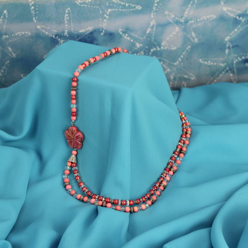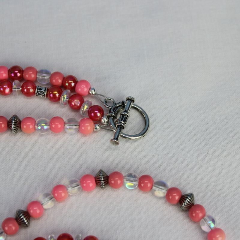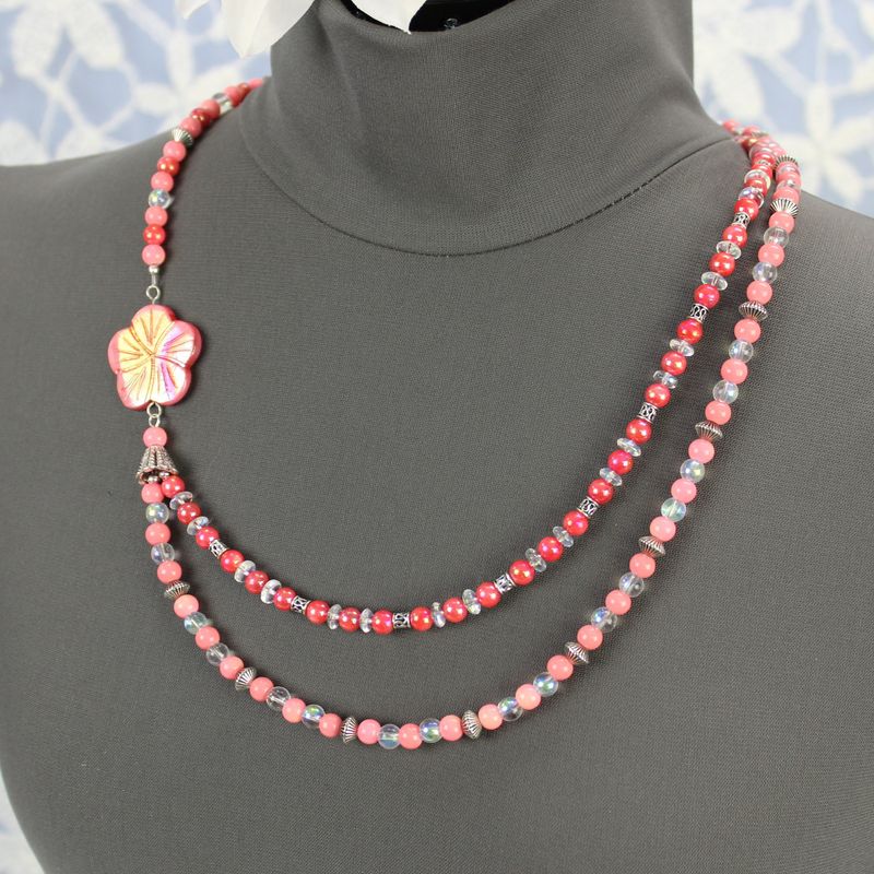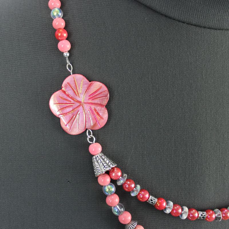 Double strand asymmetrical necklace with shell flower focal, shell and glass beads in shades of pink, coral, and clear, silver plated beads, toggle clasp