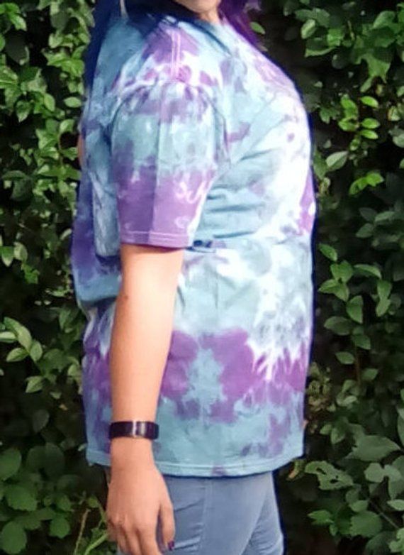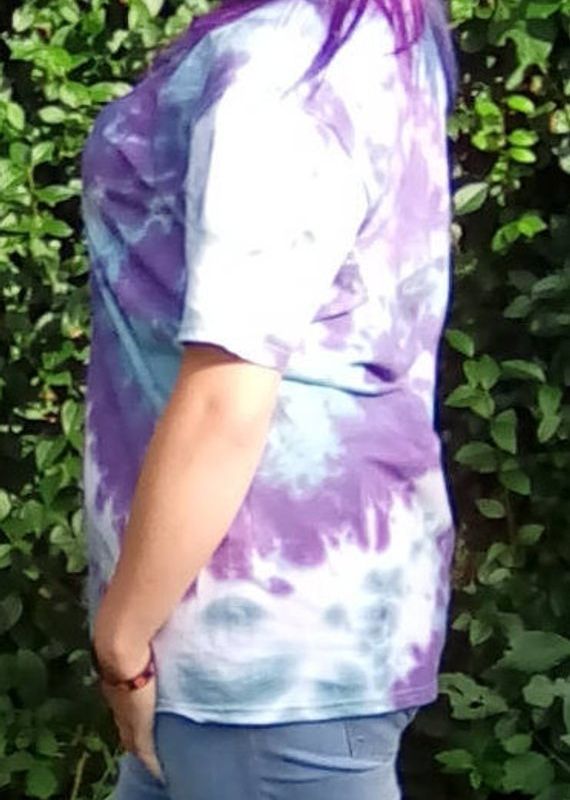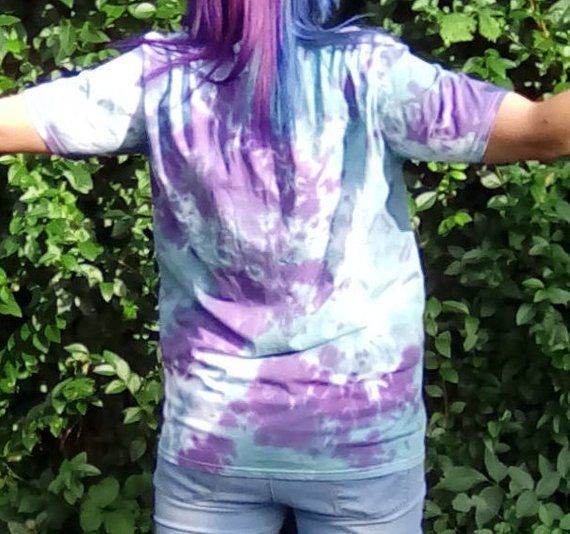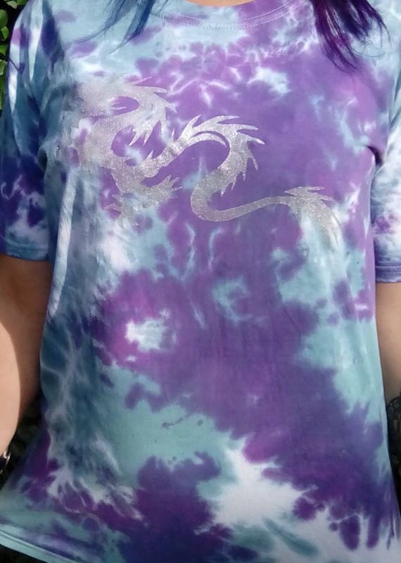 Green and Purple tie dyed t-shirt with a silver tribal dragon stencil. Item link; https://www.etsy.com/uk/listing/562941813/dragon-tie-dye-t-shirt-unisex-tie-dye-t?ref=shop_home_active_88