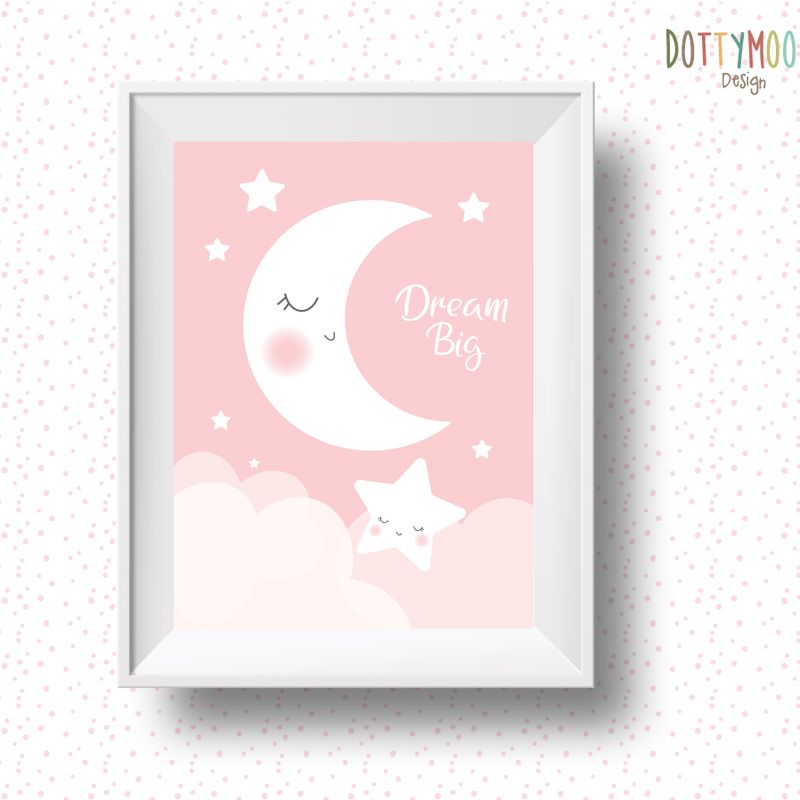 Dream big, moon and clouds- print INSTANT DOWNLOAD-DIGITAL FILES ONLY If you do not have access to a printer, I'm happy to print and send via post, please contact me for details. Nursery printable wall art, print features a cute moon and star, with dream big quote, with a pink background, perfect for a little ones room or nursery, or given as a gift. -FILES INCLUDED- 5" x 7" JPG file format-1 print. 8" x 10" JPG file format-1 print. 11" x 14" JPG file format-1 print. *If you would like alternative sizes or the PDF file to resize, please email me and i will be happy to send for no extra cost..* If you would like alternative colours to the ones listed, please email me. No physical item will be shipped , frames are for decorative uses only. Print quality will depend on paper and printers used. If you are not entirely happy with your purchase, please message me, where i will be happy to help, my main priority is that you are satisfied and 100% happy. All artwork is copyright of Dottymoondesign © By purchasing this artwork you are not acquiring the copyright, and any form of duplication or distribution is prohibited. Used for personal use only.. Thank you...