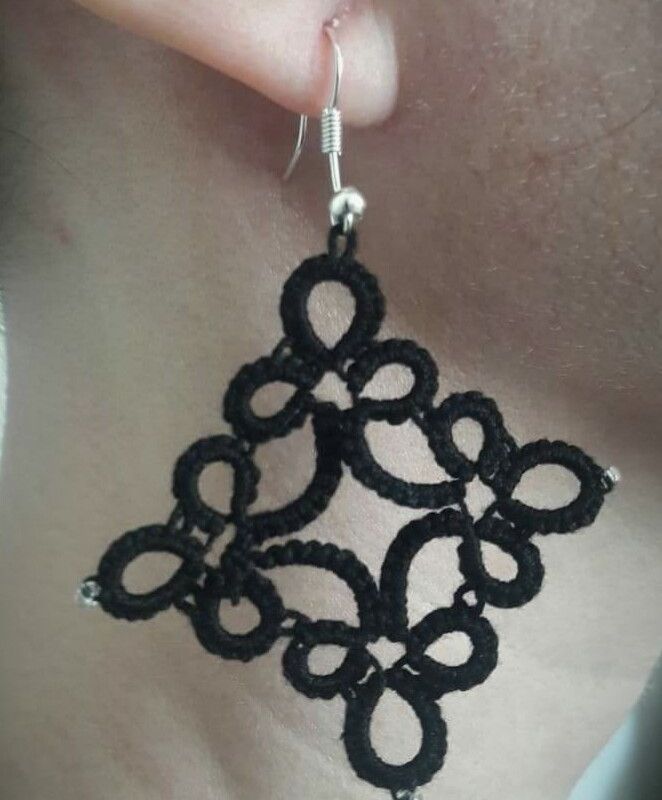 Earrings "Fantasía", handmade en technic of frivolité, color black materials: cotton and beads, length: 4.5 cm.
