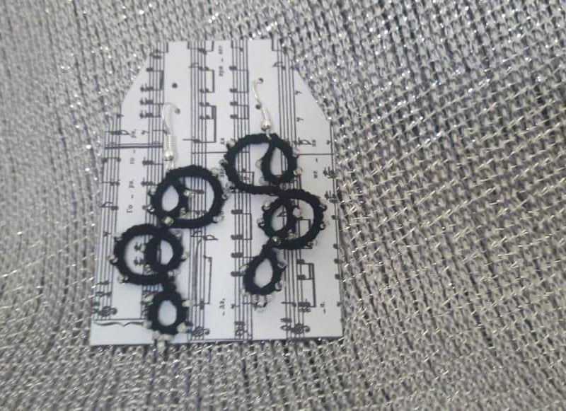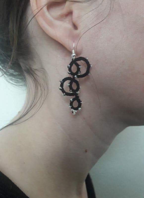 Earrings "Seawave", handmade en technic of frivolité, color black materials: cotton and beads, length: 4.5 cm.