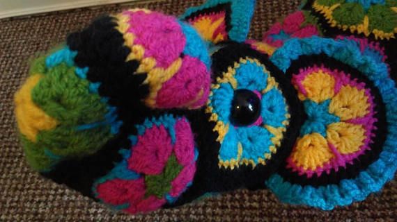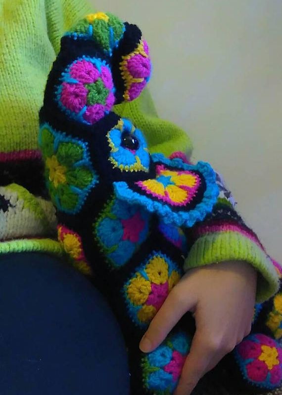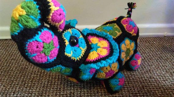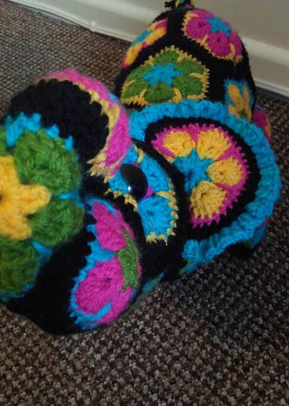 Errol the elephant is the sweetest little flower elephant you will ever find. The perfect stuffed elephant to snuggle up in bed with. Crocheted out of super bright African flowers, Errol is made of 100% acrylic yarn. He is 45cm long, from trunk to tail and 28cm tall. Unfortunately due to the holes in the flowers he is not suitable for young children