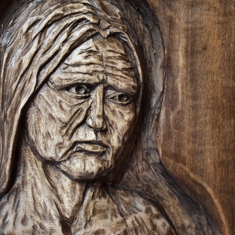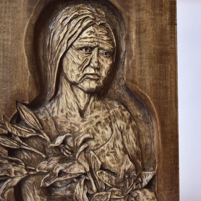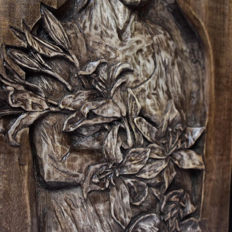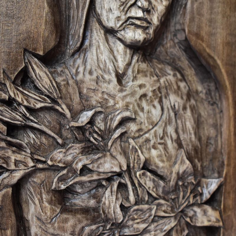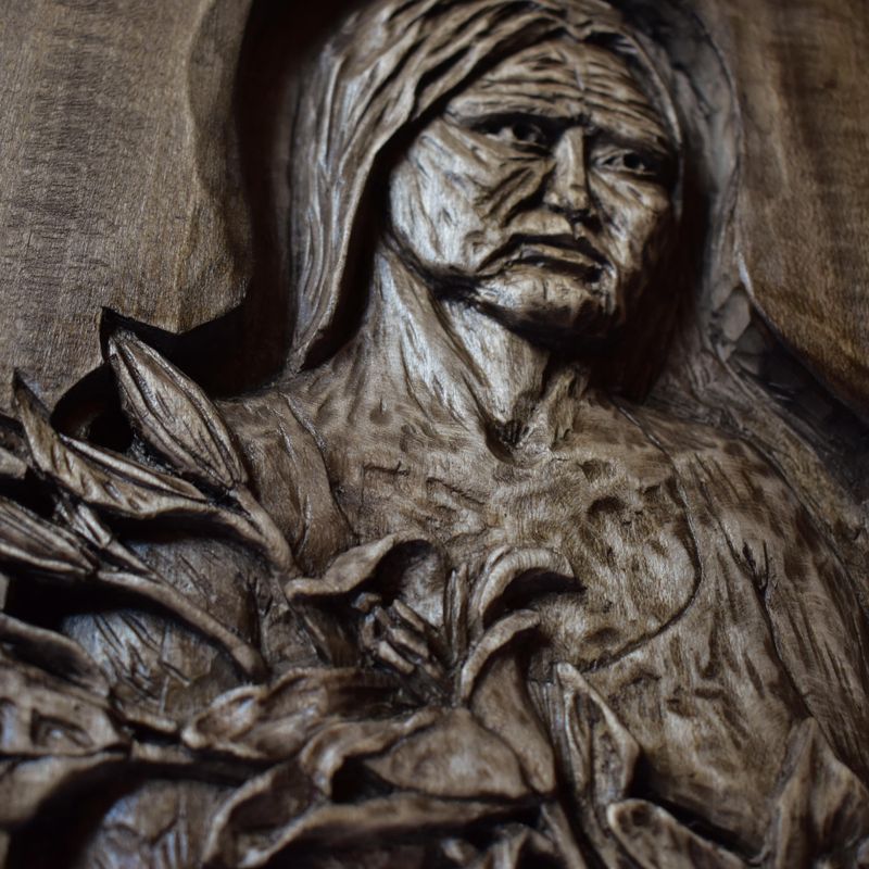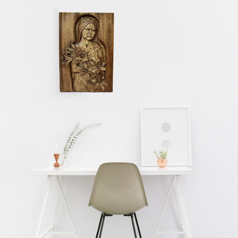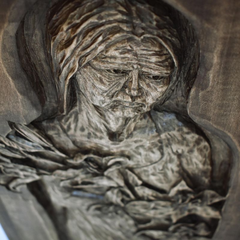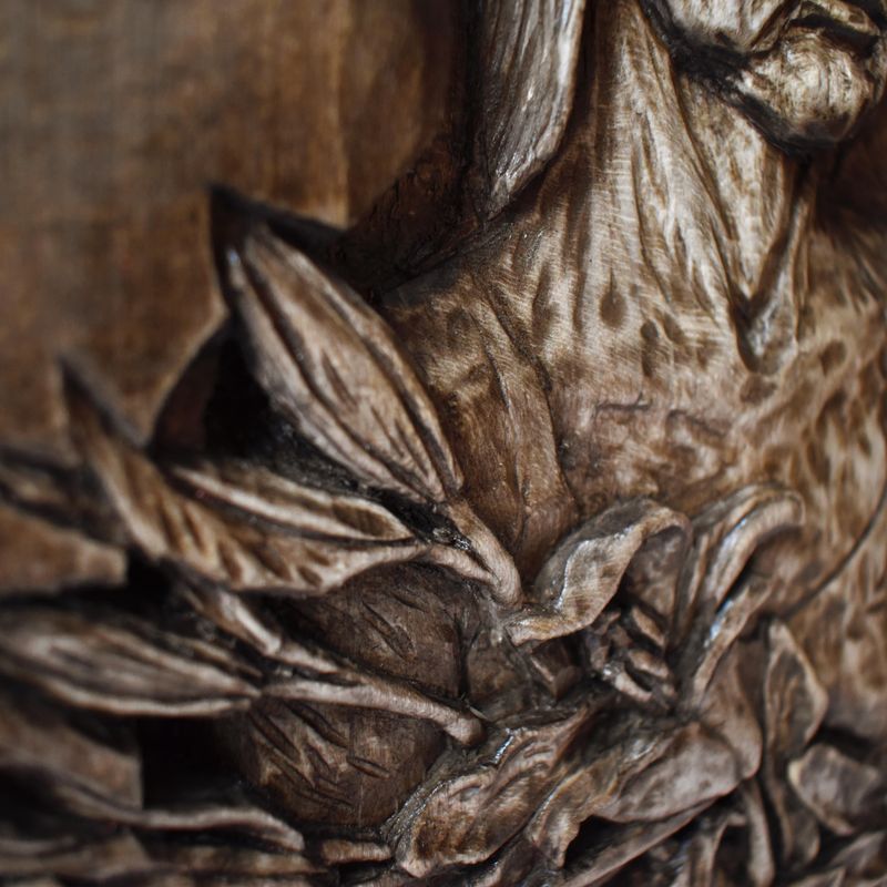 Nixie wood relief, handmade carving, basswood sculpture, mahogany wine