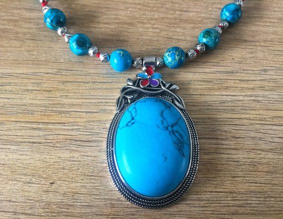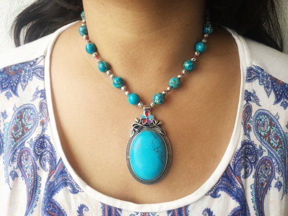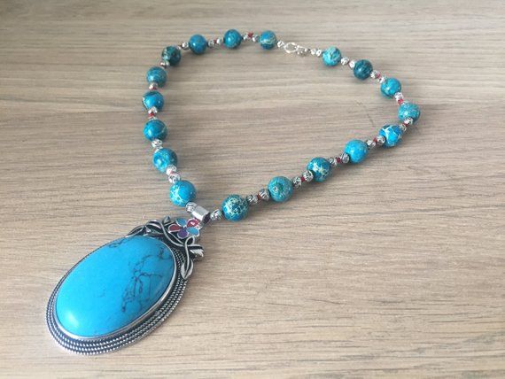** Order at - https://www.etsy.com/au/listing/613851325/faceted-howlite-mala-rare-december ** This cabochon necklace features imperial blue Jasper beads with a large azure Howlite pendant, which is the focal point of it. Howlite is a natural stone known for its powerful calming qualities and most often found in shades of blue. It is an ethnic design with a boho touch. It is carefully combined with silver beads and knotted by hand on crimson natural silk. The dark and light shades in the Jaspers emit an earthy vibe and has a beautiful chunky statement look to it. It will definitely count as one of the exclusive collections in your wardrobe. Derived from the Persian word for 'treasurer,' the significance of Jasper stone can be traced back to biblical times. Shamans and healers of the primitive era wore protective talismans and amulets that contained Jasper stones in strong natural shades like brown, red, green, and rarely blue - the colors of earth and blood, the essence of life (chi). It is the perfect wingman for your unique journey because it helps open you up to the infinite possibilities of creativity within your mind. The necklace is 18 inches and will attractively drape on your clavicle. Match it with a deep neck flat color dress and create your own unique ethnic style at parties and celebrations. Item is ready to be shipped Length of necklace - 18 inches (45.72 cm) Length of Pendant - 2 inches (5.08 cm) For information on Returns and exchange, please refer: https://www.etsy.com/shop/deckorate#policies Do check out other necklace designs by me at https://www.etsy.com/au/shop/Deckorate?ref=seller-platform-mcnav§ion_id=23205309 https://www.etsy.com/au/shop/Deckorate?ref=seller-platform-mcnav§ion_id=23205317 Order together to pay single shipping. Thank you for visiting my shop https://deckorate.etsy.com Love unique. Buy handmade. ❤ Madhuleena