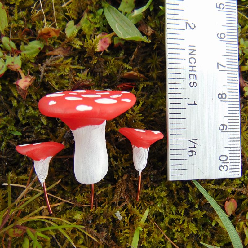 This table and chair set is the perfect addition to your fairy garden or succulent garden! They are completely handmade and hand painted, and they have copper wire posts on the bottom for easy standing in soil or moss. The table measures about 1 inch tall by 1 inch diameter, and the chairs are about 0.5in. by 0.5in. https://www.etsy.com/shop/SolarCrush