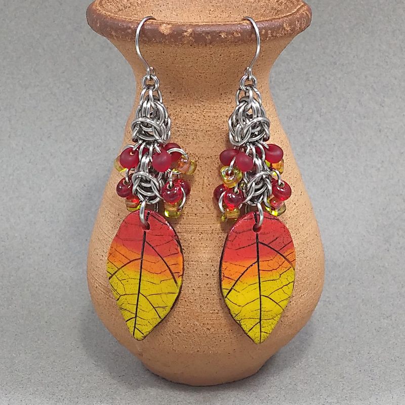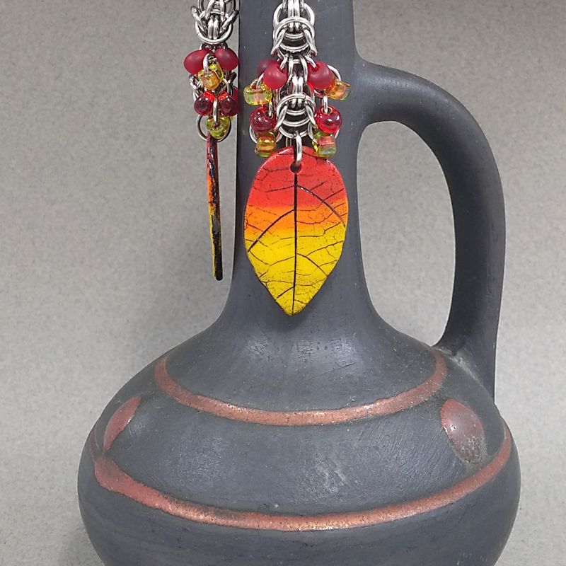 Fall Leaves Earrings with Artisan Made Polymer clay components & Chainmail