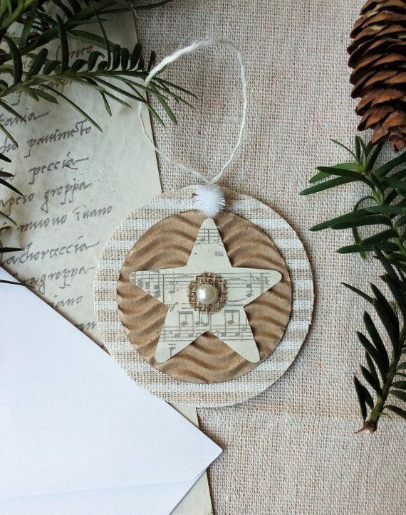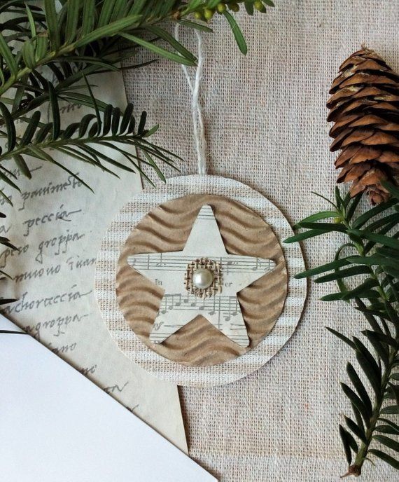 Set of three shabby chic Christmas tree ornaments made from cardboard, decorative fabric, decorative printed paper, burlap and plastic pearl. Great for Christmas tree, fireplace, wreath, staircase or as a finishing touch to any gift package. Dimension 2.4" (6.3 cm) Completely handmade and so cute for the upcoming holidays!