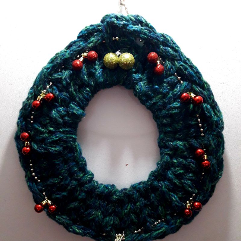 Christmas wreaths are a wonderful way to start the festivities at the entrance to your home. They add an attractive touch to your front door Their circular shape can represent eternity (see D&C 35:1). Wreaths hung on doors or in windows are like a symbolic invitation for the spirit of Christmas to fill our homes with the joy of the season. Materials: Moher yarn,bead garland,christmas baubles and bell