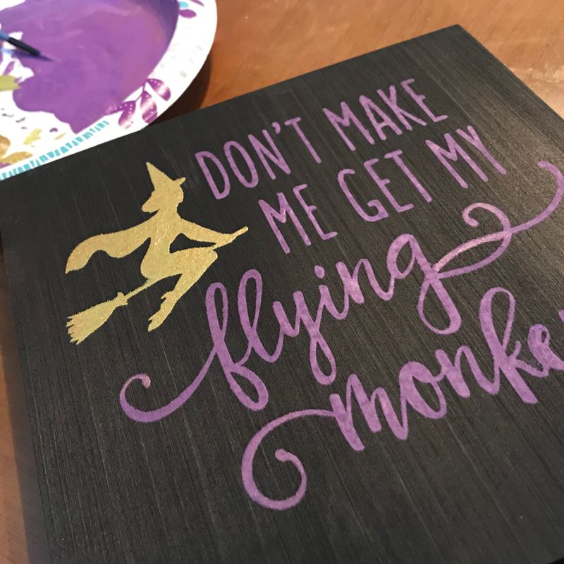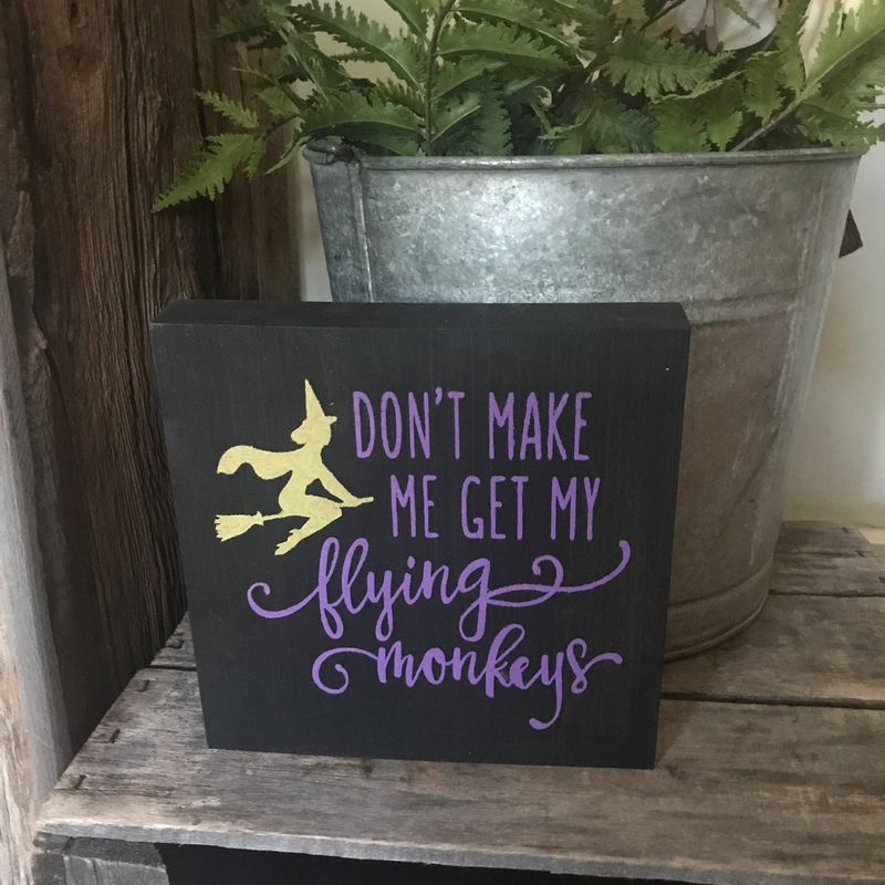 Don’t make me get my flying monkeys...This adorable sign is the perfect addition to your Halloween/fall home decor! It would look great in any room of the house, perfect size to tuck onto a shelf or even sit on the window sill to create the perfect mood. This sweet little sign has a black stained background with the words “Don’t make me get my flying monkeys” painted in green/purple with a gold sparkle. This sign approximately measures 7.25“ L x 7.25“ H and is 1/2” thick. Please note, because these signs are handmade, each one may vary slightly and will provide you with a very unique item. This listing is for one unframed sign. Want to add a frame? Simply send us a Convo and we can add a frame to your sign for an additional cost. Please feel free to contact us with any questions. Thank you for visiting The Country Cowshed! Follow us on Facebook for updates, specials and more photos: www.facebook.com/thecountrycowshed For more vintage and handcrafted items, you can check out our Etsy listings here: www.etsy.com/shop/TheCountryCowshed