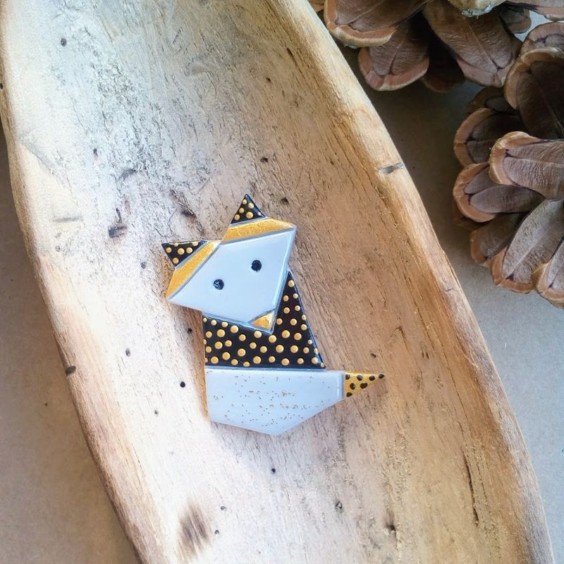 Full body origami style fox brooche made from polymer clay
