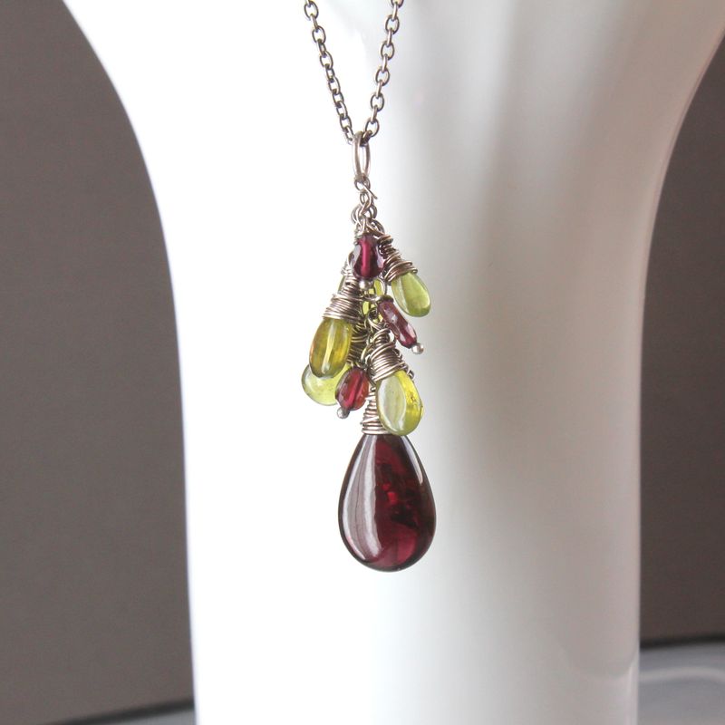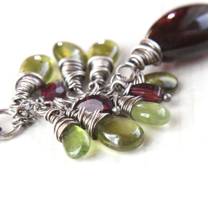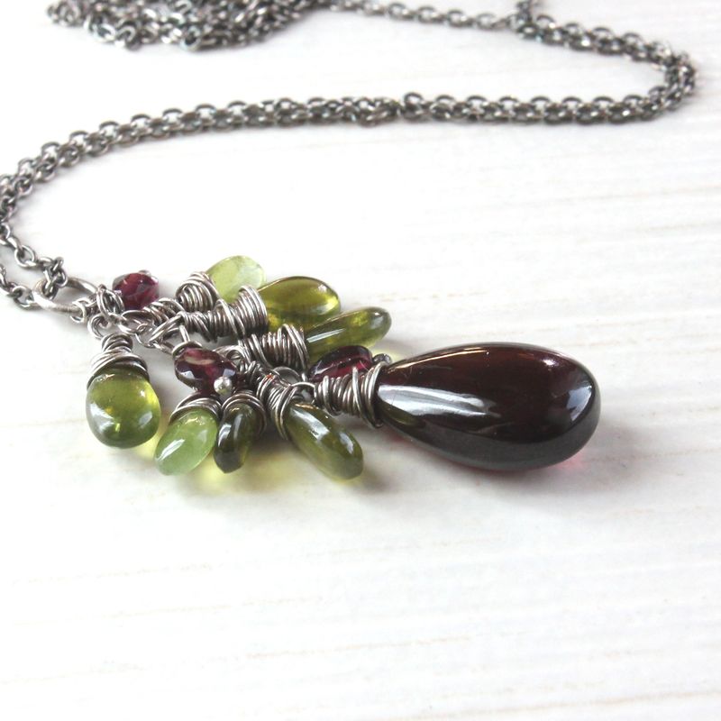 Cluster garnet necklace which is created with a cluster of smooth and faceted red garnet and green vessonite(green garnet) over a smooth, dark red garnet drop. I`ve wrapped all gemstones to silver chain. The necklace closes with a lobster trigger clasp. All metal is oxidized sterling silver(925s) Pendant is appr. 2 inches (50 mm) The chain is 18 inches (46 cm)