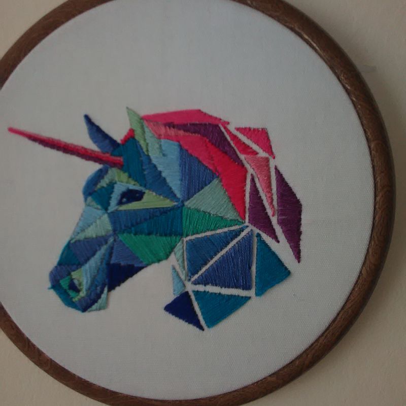 Hand embroidered Unicorn set in a 6 inch round wooden effect flexi hoop.