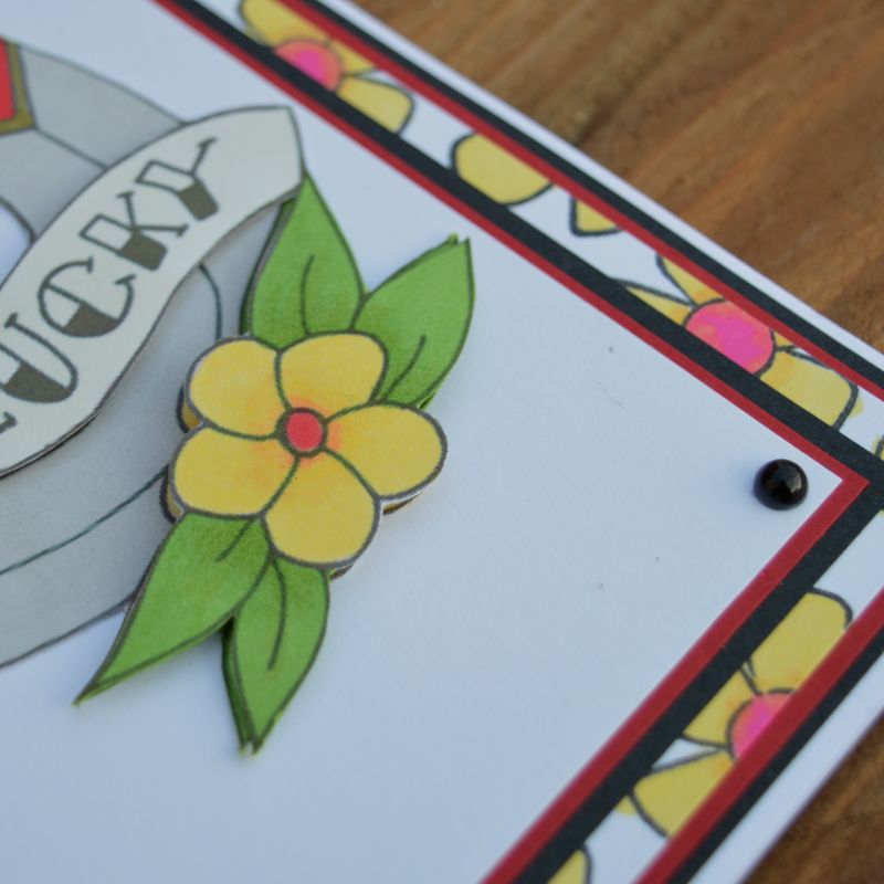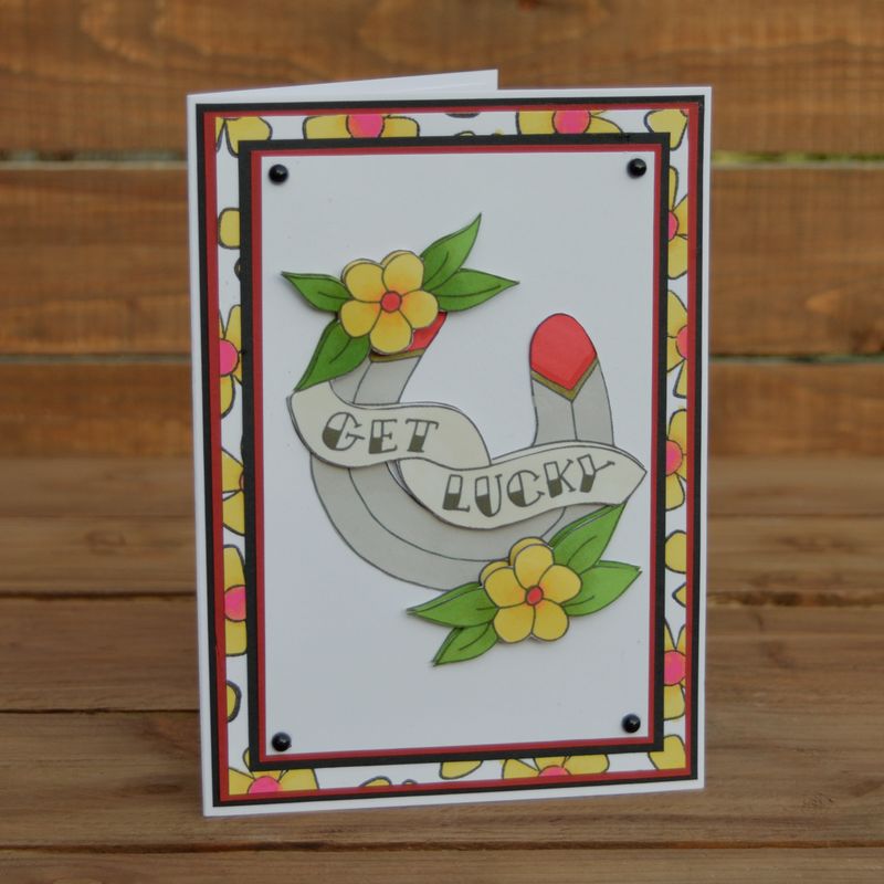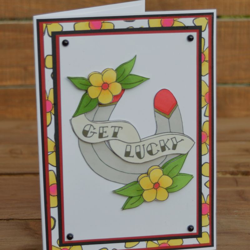 This alternative card is handmade using high quality card stock and has been decorated with a hand stamped backing paper and four hand coloured toppers. The wording on this card reads "Get Lucky" so it would make a great good luck card! This horse shoe greetings card is blank inside so can be used for any occasion, ideal for writing your own message inside. It also comes with an envelope and is packed in a clear cello bag. This gothic card measures 5 inches by 7 inches. SHIPPING FROM THE UK - Shipping Prices Vary - www.redvesseldesigns.com