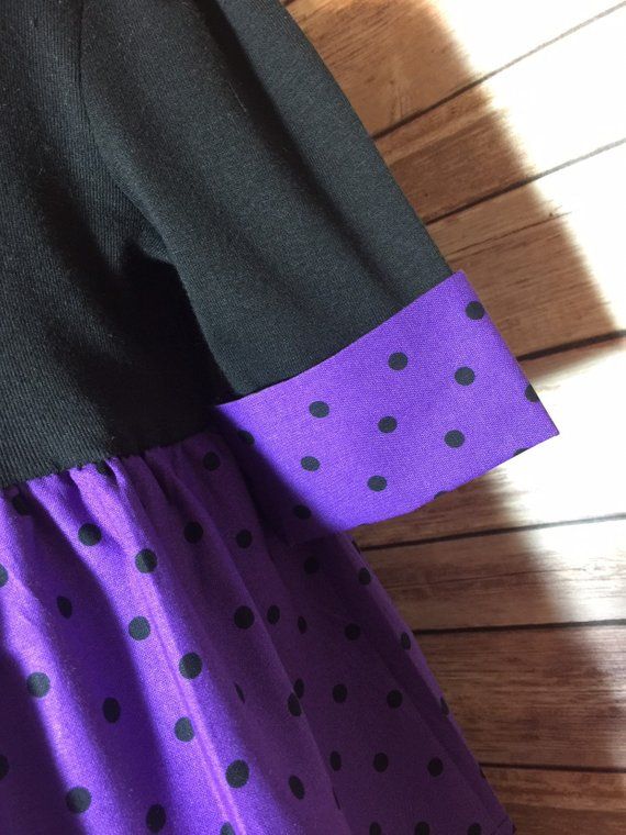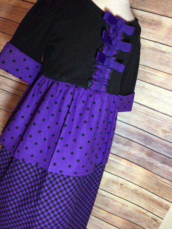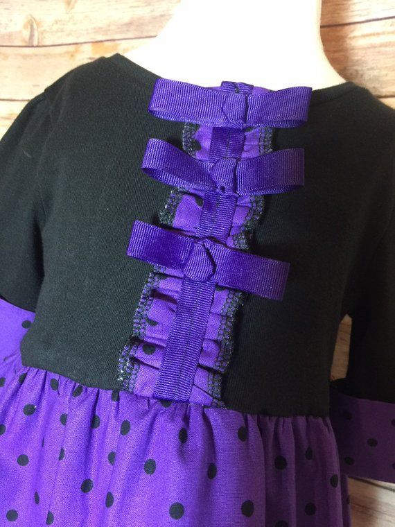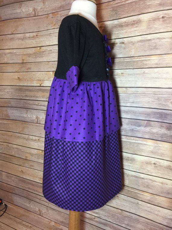 This is a beauiful upcycled dress is made from a Carters tshirt and gorgeous multipatterned purple and black cotton material. It has been adorned with purple crossgrain ribbon bows and cuffs on the sleeves. Size: 3 Toddler Length: 25 inches from shoulder to hem Sleeve Length: Stops at Elbow This dress is made from quality material and all seems have been serged for a finished look.