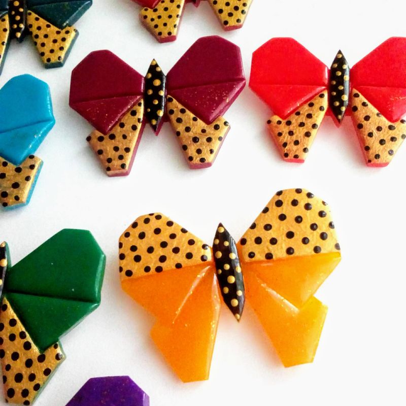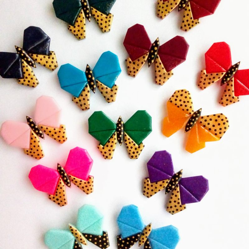 Minimalist graphic origami style butterfly brooches made of polymer clay