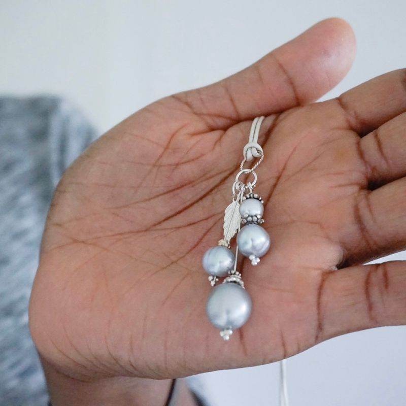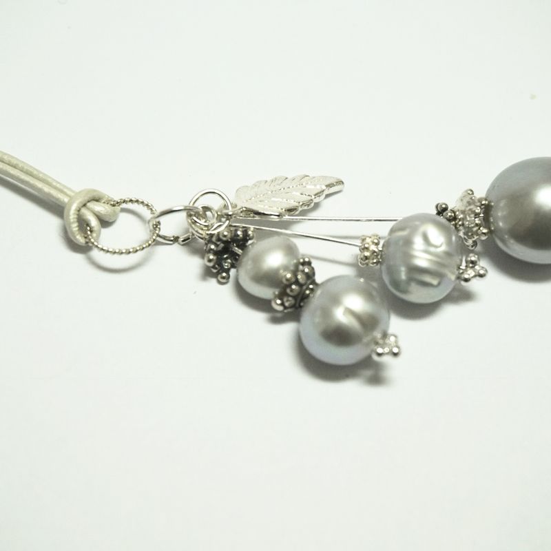 This very pretty pendant necklace is about 50cm long; so falls just below the collarbone. It has three different pendants of grey baroque pearls with Sterling Silver Bali beads and a Sterling Silver leaf. They are all suspended from a white leather thong via a fancy Sterling Silver jump ring. The overall effect is very feminine and elegant. Remember that freshwater pearls are organic and as such have slight imperfections. ~~~~~~~~~~~~~~~~~~~~~~~~~~~~~ Check me out on social media for updates: https://www.facebook.com/VivulaW/ https://twitter.com/VivulaW https://www.instagram.com/vivulaw/