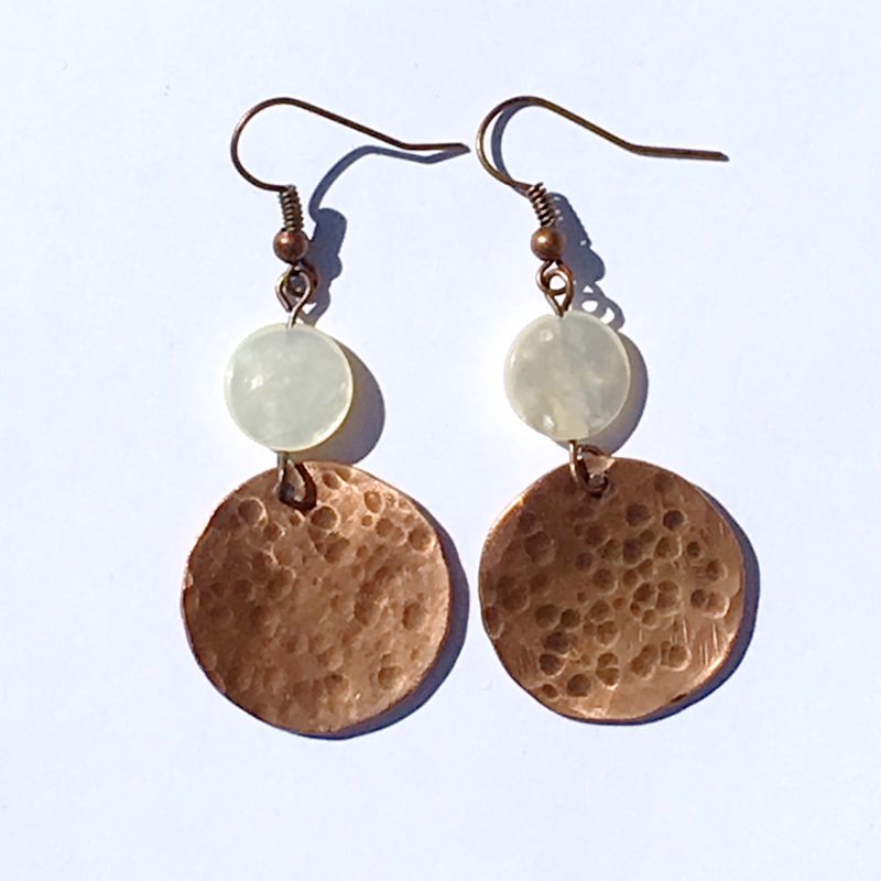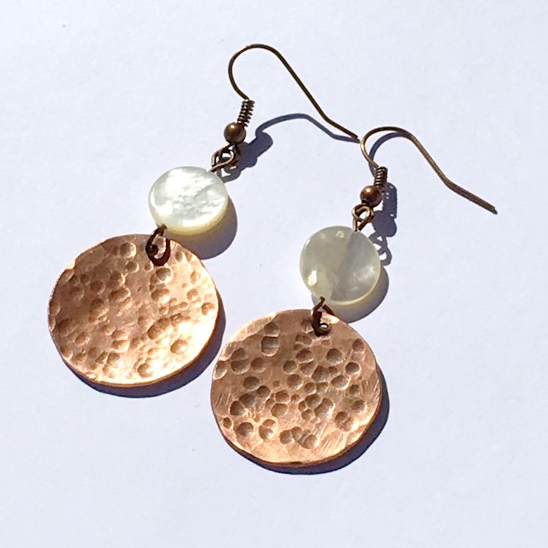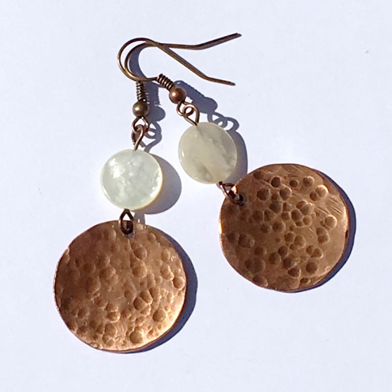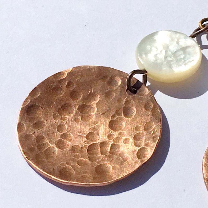 Hammered copper moon earrings with mother of pearl