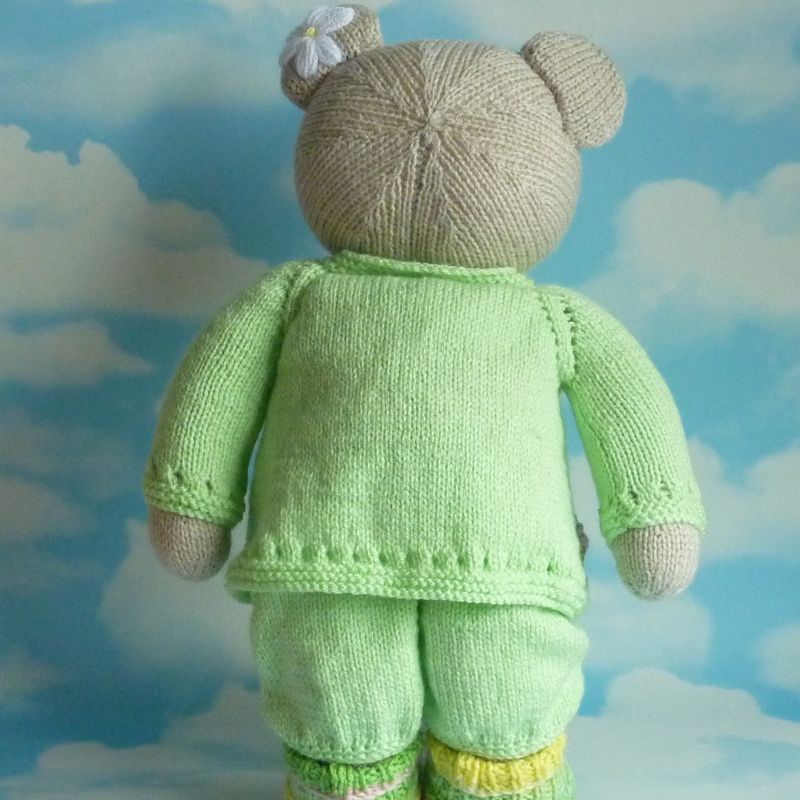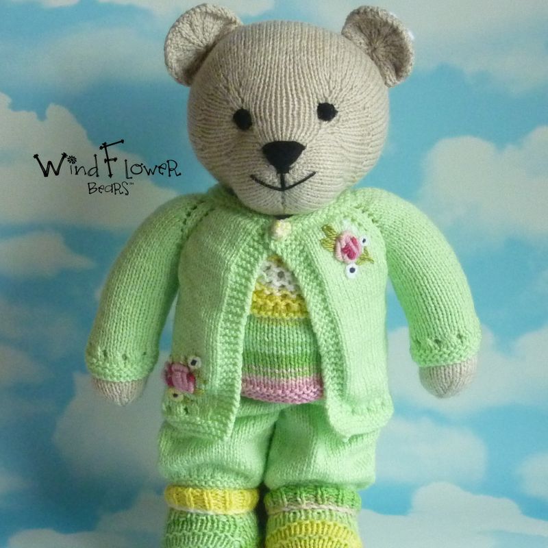 This is Windflower bear Lettuce, a handmade, one-of-a-kind bear. . Hand knitted to a high standard and comes with it's own individually designed hand knitted outfit. A special windflower is embroidered on the left ear and each bear arrives in their own protective linen bag. Comes with a card containing bear's details of birth,to which we can add recipients name and a phrase or quote of your choosing, up to 70 characters long. To make your bear extra special, we can stitch up to two initials onto the right ear, free of charge. All bears stand approximately 38cms tall and are approximately 25cms wide. Made from acrylic yarn and can be machine washed and tumble dried on a delicates cycle. Bears are filled with 100% Hi-loft polyester soft filling, which conforms to BS1425, BS5852, EN71 and are CE marked. PLEASE NOTE; Due to the nature of wool and the tendency of young children to suck their toys, children under 3yrs should be supervised. .**FREE UK shipping and reduced rates for the rest of the world.*