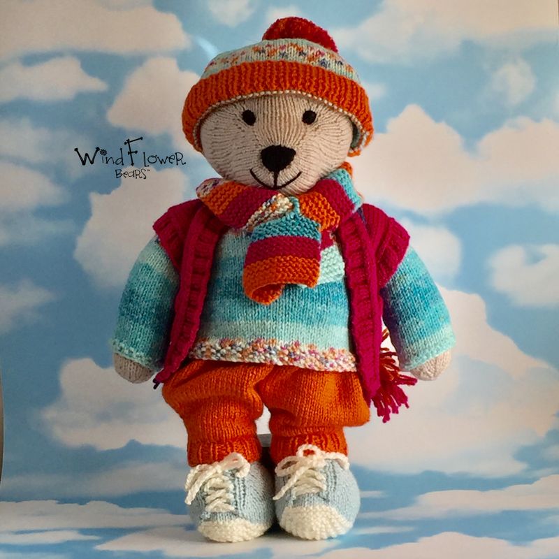 This is Windflower bear Rocket, a handmade, one-of-a-kind bear. . Hand knitted to a high standard and comes with it's own individually designed hand knitted outfit . A special windflower is embroidered on the left ear and each bear arrives in their own protective linen bag. Comes with a card containing bear's details of birth,to which we can add recipients name and a phrase or quote of your choosing, up to 70 characters long. To make your bear extra special, we can stitch up to two initials onto the right ear, free of charge. All bears stand approximately 38cms tall and are approximately 25cms wide. Made from acrylic yarn and can be machine washed and tumble dried on a delicates cycle. Bears are filled with 100% Hi-loft polyester soft filling, which conforms to BS1425, BS5852, EN71 and are CE marked. PLEASE NOTE; Due to the nature of wool and the tendency of young children to suck their toys, children under 3yrs should be supervised. **FREE UK shipping and reduced rates for the rest of the world.*