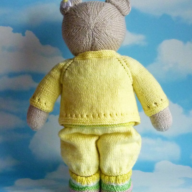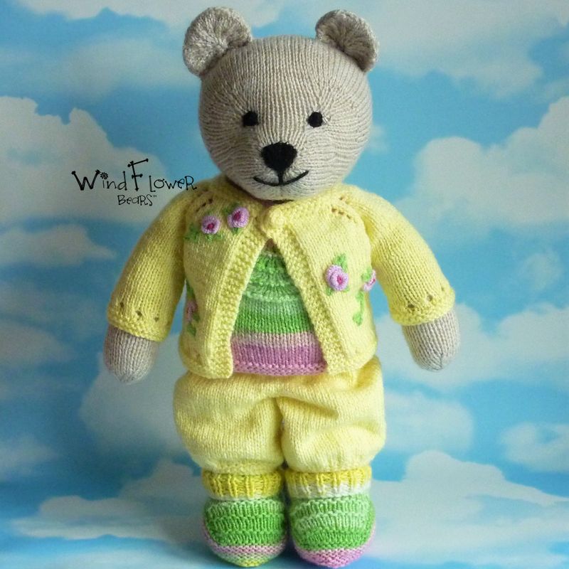 This is Windflower bear Celandine, a handmade, one-of-a-kind bear. Hand knitted to a high standard and comes with it's own individually designed hand knitted outfit. A special windflower is embroidered on the left ear and each bear arrives in their own protective linen bag. Comes with a card containing bear's details of birth,to which we can add recipients name and a phrase or quote of your choosing, up to 70 characters long. To make your bear extra special, we can stitch up to two initials onto the right ear, free of charge. All bears stand approximately 38 cms tall and are approximately 25 cms wide. Made from acrylic yarn and can be machine washed and tumble dried on a delicates cycle. Bears are filled with 100% Hi-loft polyester soft filling, which conforms to BS1425, BS5852, EN71 and are CE marked. PLEASE NOTE; Due to the nature of wool and the tendency of young children to suck their toys, children under 3 yrs should be supervised. **PRICE INCLUDES - Free UK shipping and reduced rates to the rest of the world.**