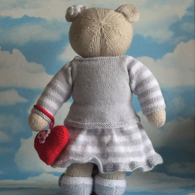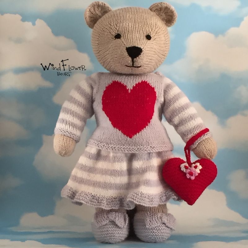 This is Windflower bear Lovage, a handmade, one-of-a-kind bear. Hand knitted to a high standard and comes with it's own individually designed hand knitted outfit. A special windflower is embroidered on the left ear and each bear arrives in their own protective linen bag. Comes with a card containing bear's details of birth,to which we can add recipients name and a phrase or quote of your choosing, up to 70 characters long. To make your bear extra special, we can stitch up to two initials onto the right ear, free of charge. All bears stand approximately 38 cms tall and are approximately 25 cms wide. Made from acrylic yarn and can be machine washed and tumble dried on a delicates cycle. Bears are filled with 100% Hi-loft polyester soft filling, which conforms to BS1425, BS5852, EN71 and are CE marked. PLEASE NOTE; Due to the nature of wool and the tendency of young children to suck their toys, children under 3 yrs should be supervised. **PRICE INCLUDES - Free UK shipping and reduced rates to the rest of the world.**