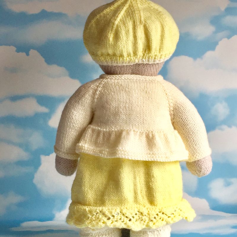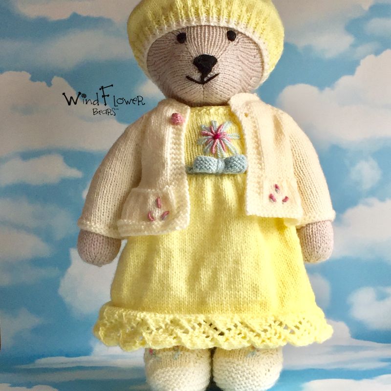 This is Windflower bear Primrose, a handmade, one-of-a-kind bear. Hand knitted to a high standard and comes with it's own individually designed hand knitted outfit. A special windflower is embroidered on the left ear and each bear arrives in their own protective linen bag. Comes with a card containing bear's details of birth,to which we can add recipients name and a phrase or quote of your choosing, up to 70 characters long. To make your bear extra special, we can stitch up to two initials onto the right ear, free of charge. All bears stand approximately 38 cms tall and are approximately 25 cms wide. Made from acrylic yarn and can be machine washed and tumble dried on a delicates cycle. Bears are filled with 100% Hi-loft polyester soft filling, which conforms to BS1425, BS5852, EN71 and are CE marked. PLEASE NOTE; Due to the nature of wool and the tendency of young children to suck their toys, children under 3 yrs should be supervised. **PRICE INCLUDES - Free UK shipping and reduced rates to the rest of the world.**