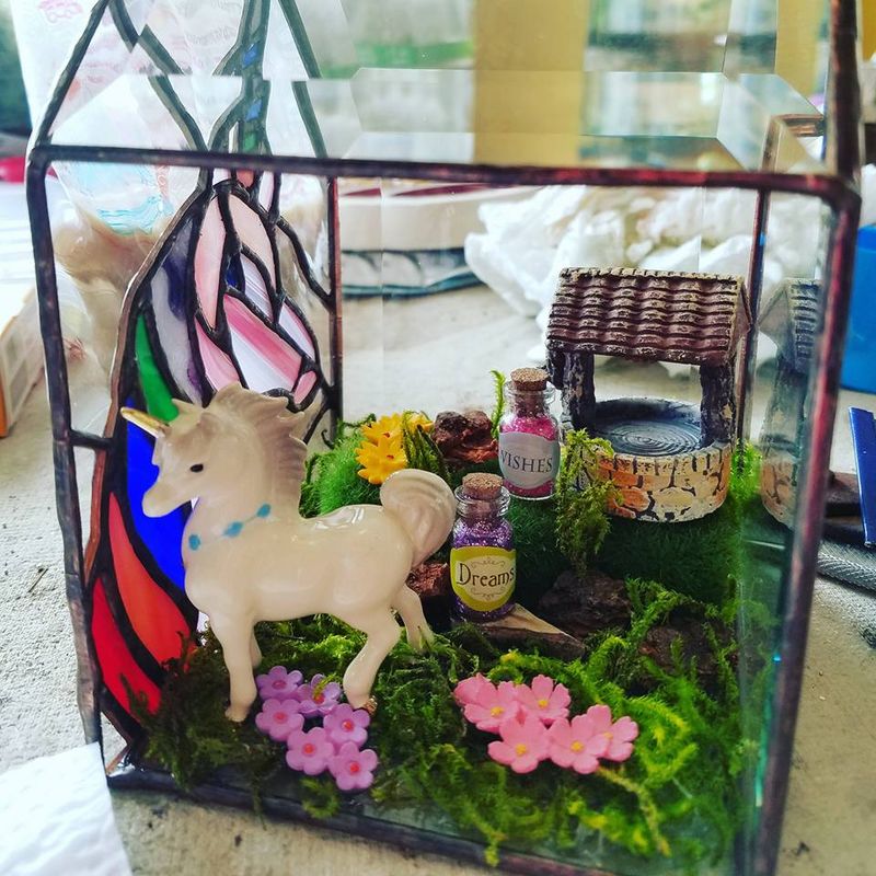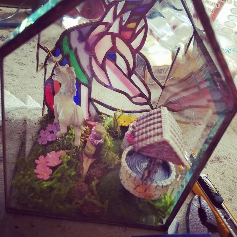 Hand Made OOAK Rainbow Unicorn Stained Glass Box w/ Miniature Fantasy Scene