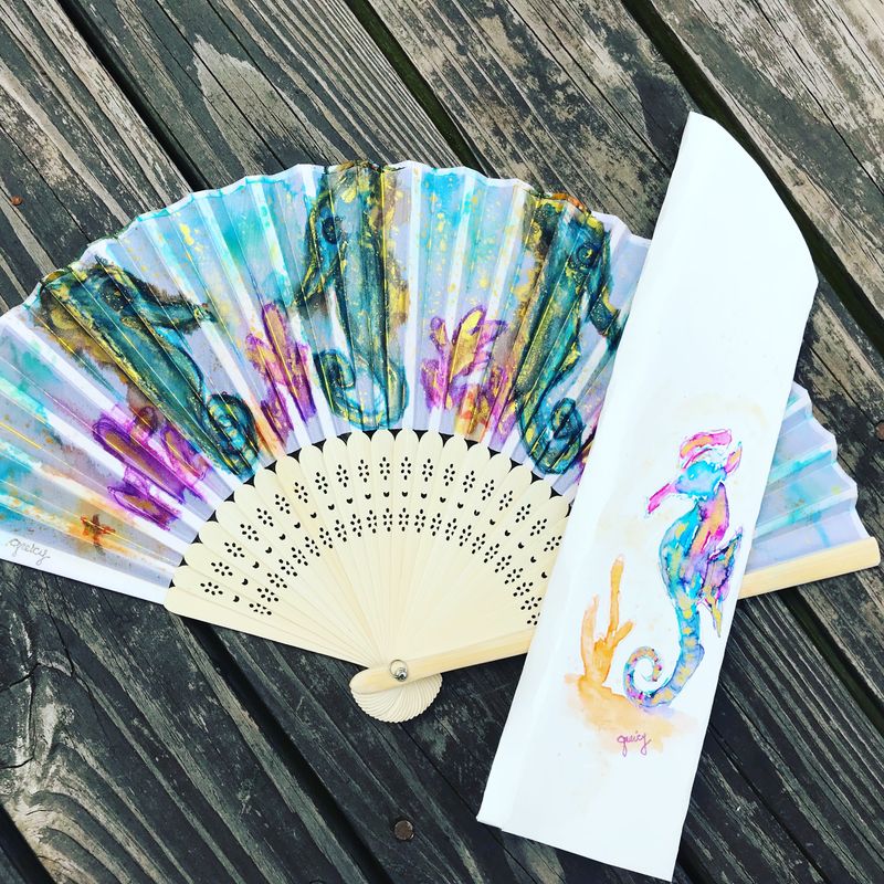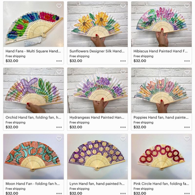 Hand Painted Hand Fans - Choose from a Great Variety of Beautiful Styles - Handfan, Gift for Her, Gift for Mom, Fun and Stylish Accessory Each of the hand fans here has a individual listing in my shop 😃 choose one and enjoy! 🎁🌟🎉🎁🌟🎉 Don’t you just love hand fans? Me too! I think hand fans are a great and timeless fashion accessory! It is elegant and feminine... and, at the same time, with the beautiful designs I have created, modern and funky! Choose one (or two, or three 😁) of the many styles I have created and painted myself by hand. You can enjoy your hand fan in outdoor events, restaurants, concerts... they are also a great accessory for an outdoor wedding, beach wedding or just to hang out at the poolside or while at the beach! And don’t forget to take one to a club or dancing party! Keep cool in style! 💕🎉🎊 Hand fans are also a great gift to a girlfriend, sister, mom... they will love them as much as you and I do! 🎁😁😁 Each handfan comes with a matching handmade, handpainted case, designed and painted by me, so you can take them in your purse anywhere and everywhere!!! All my hand fans are Hand-painted in Watercolor by me. The painting in the fan, as well as in the case, has been sealed so the it does not wear out with use. Unique Design - Silk fabric, handpainted in watercolor. Bamboo ribs - width (when open) approximately 14.6", length approximately 8.3". ⭐️ More styles available, see additional pictures and my shop listings⭐️ Thank you! Free (and fast!) shipping in the USA