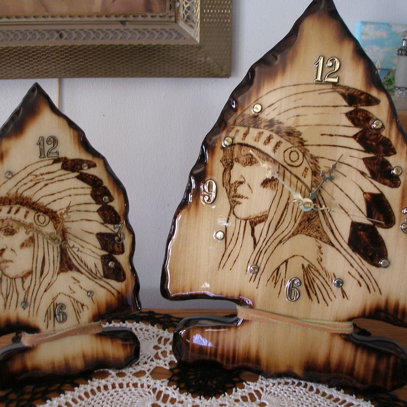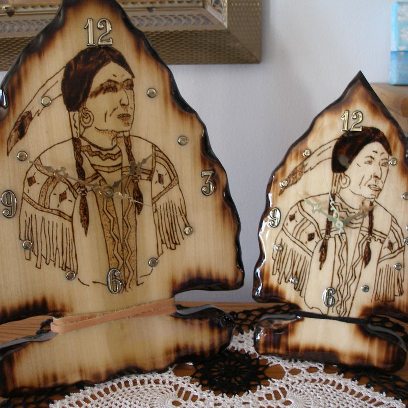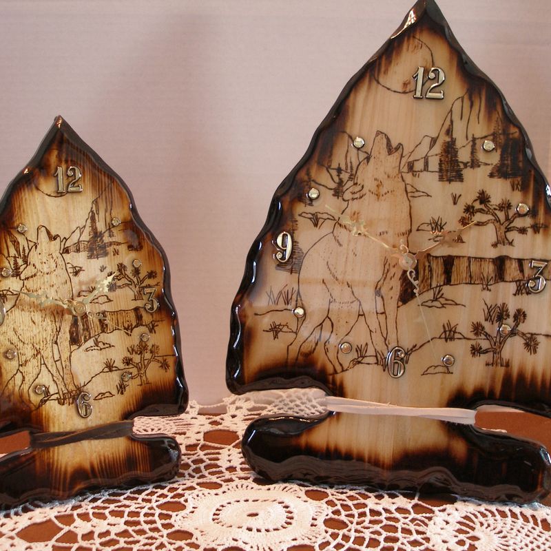 These arrow shaped clocks are hand cut, hand sanded, torch burned and then hand wood burned. 2 sizes are available. Small arrow is $60 and large arrow is $80. 2 part epoxy covers front and is easily cleaned with pledge and soft cloth. The quartz clocks are AA powered. These beautiful clocks can stand as shown or hang on a wall. Change your decor, change how these clocks are displayed. Price does not include s&h
