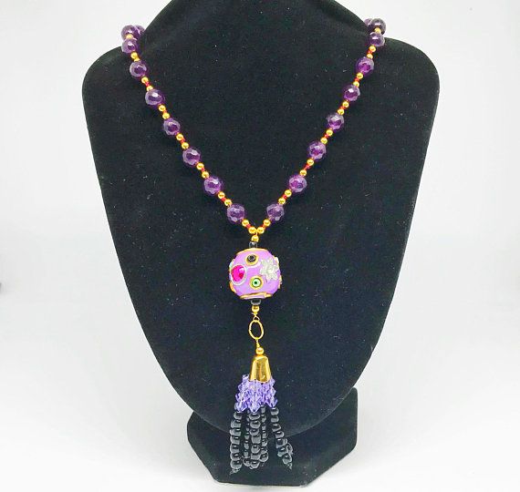 The chunky beads hand knotted imperial jade necklace with a dazzling black and mystic purple tassel pendant is for all the statement lovers out there. Purple jade, or the Dream Stone, is the gem of mirth and happiness. In shades of light to dark violet, its frequency speaks of spiritual knowledge and creative art. The birthstone of March borns, the imperial jade is the symbol of good luck and inner peace in many cultures. The focal point of this mystic purple necklace is the dangling handmade beaded tassel Swarovski pendant with a purple Kundan (Indonesian) bead, that adds sheer glory and dazzle to it. Crystals are famous for their hypnotising beauty and has been sculpted, polished, and designed into jewelry for many years. Swarovski, synonymous with quality and style, have been the leaders and creators of cut crystal for over 100 years. Whether you are dressed elegantly for a wedding party or dressed simplistically for an evening out with friends, this single strand gemstone mala will surely catch eyes wherever you go. Item ready to be shipped. Free shipping within Australia. Length of necklace - 24 inches (60.96 cm) Length of beaded tassel Kundan pendant - 3 inches (7.62 cm) Thank you for visiting my shop https://deckorate.etsy.com Love unique. Buy handmade. ❤ Madhuleena