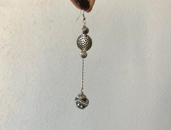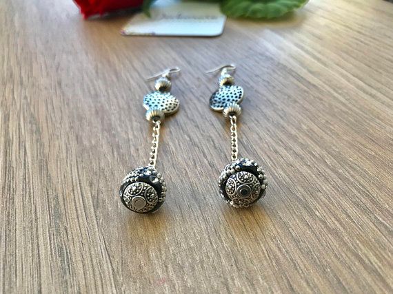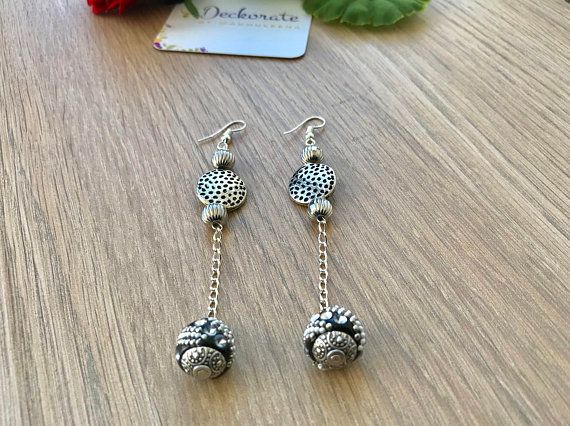 **Order at - https://www.etsy.com/au/listing/623880795/boho-chain-earring-long-statement ** Jewelry has been one of the most significant adornments for women since ages. A piece of jewelry is a part of a woman's personality, a reflection of her mood, and the replica of her true identity. These gorgeous earrings wired with black and silver Kashmiri beads are simply stunning and gives the wearer a regal air. Topped with a silver chain with oval oxidized silver beads, this statement earring is all about your expressing your inner beauty and creative self. Wear it with an evening out party wear or with a gorgeous ethnic embroidered tunic or 'kurta', and make your own statement wherever you go. Item is ready to be shipped. Free Shipping Within Australia Length of drops - 3 inches (7.62 cm) Please Note - For hygiene reasons, each earring will be sent with a new earring wire, not the one worn by the model in the photo Thank you for visiting my shop https://deckorate.etsy.com Love unique. Buy handmade. ❤ Madhuleena