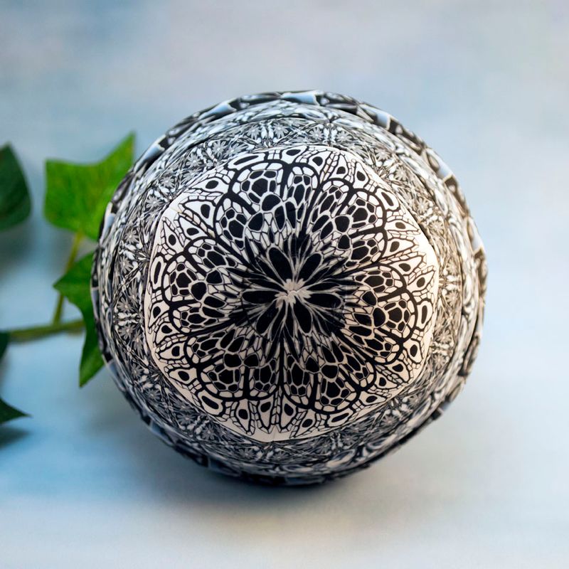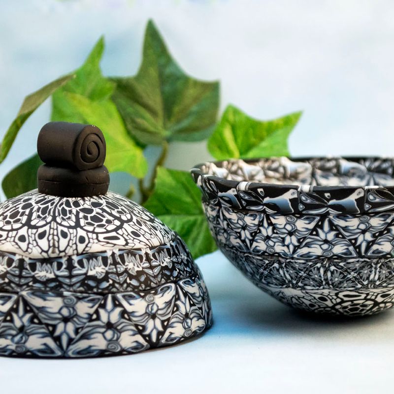 This small polymer clay lidded bowl is just the right size to hold your rings while washing hands or dishes Or the perfect place to for earring or little trinkets. Polymer clay is waterproof so keeping it near the kitchen sink or on the bathroom vanity is the perfect place for it. This bowl measures approximately 3.5" tall x 3" wide The bowl is decorated with slices from my own handmade polymer clay canes. With a black and white lace design which is not painted on and will not wear away or wash off over time. It is unique and one of a kind. You'll never see anything like it.