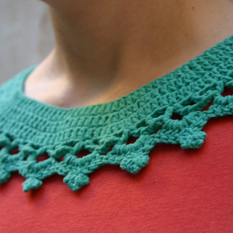 Its a handmade collar. Crochet with cotton yarn. It has a special green color with a little bit of blue inside. The diameter of the collar is 52cm or 20.5in. Easy to wear and wash it with no problem. Its a vintage style collar but also for an everyday ware!