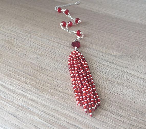** Order at - https://www.etsy.com/au/listing/603198812/crystal-tassel-necklace-long-fringe ** This long and shiny red crystal tassel necklace has a timeless, classy look. The beaded tassel is made with crimson red seed beads and small silver beads, on a sterling silver gorgeous bead cap and a ruby red stone. Over the thick beaded tassel is a light silver chain carefully wire wrapped with Ruby Red Chinese Crystals that gives it the perfect finish. The beaded tassel has 10 drops that make it dazzling and adds a sparkle to it. The flowy pattern and the flexibility of the necklace makes it a comfortable accessory for your favorite party. Use it as a gift for someone special, or give a treat to yourself with this exclusive design. Item is ready to be shipped. Free shipping within Australia. Length of necklace - 28 inches (71.12 cm) Length of Tassel Pendant - 5 inches (12.7 cm) For information on Returns and exchange, please refer to: https://www.etsy.com/shop/deckorate#policies Order together to pay single shipping. Thank you for visiting my shop https://deckorate.etsy.com Love unique. Buy handmade. ❤ Madhuleena