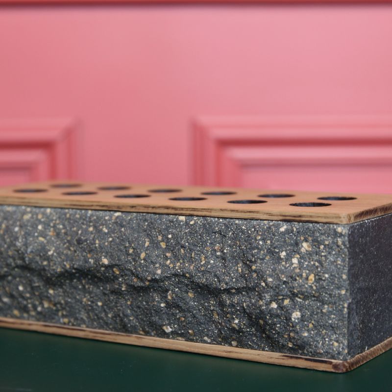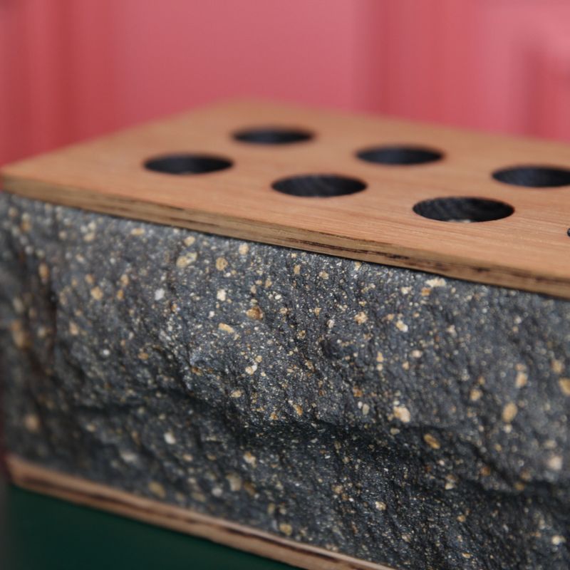 Stylish and brutal. Our new Stone Organizer is perfect for the desktop, workshops, kitchens and even for the bathroom. It looks amazing both in an office and home interior. This Organizer is made from natural materials by our artisans. They use real stone and wooden lamellas to create such an unusual multi-functional item. Our desktop organizer has 12 slots and is perfect to hold pens and pencils, makeup and toothbrushes, or any other accessories. Its weight is approximately 2.5 kg, so be sure, it will be not easy to drop it to the floor. Arrange your space and enjoy it! Please note: Each item is one of a kind, with unique stone colors and textures: some lighter, some darker and some even a combination of both. Due to a unique appearance, your stone organizer may differ from those shown in the images. Product dimensions: Width: 25 cm Length: 10 cm Height: 7.5 cm
