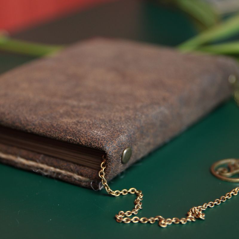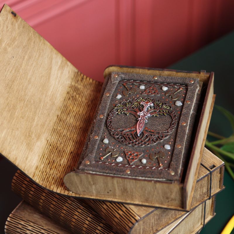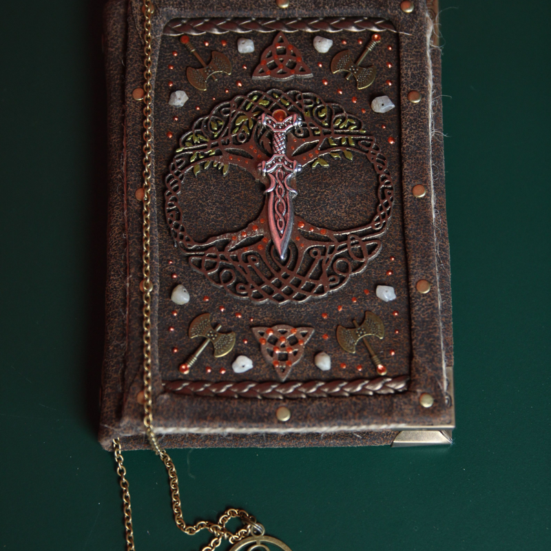 Organize your day with a custom notebook! Handy and stylish, our handmade journal is the perfect accessory to keep your notes organized. This “Celtic Brown” notebook is made by hand with great attention to detail and quality. The front cover is made from real animal leather and decorated with stones, metallic Triquetra, Tree of life, and Sword Symbols in the center. What do these symbols mean? Triquetra - is the symbol of destiny, power, strength, wisdom, leadership, and endurance. The Tree of Life is a symbol of balance and harmony. And Celtic Sword is connected to gain, wealth, honor, and establishment of hierarchy. Please note: Pages are fixed by hand. It’s 100% handmade item. Each notebook comes in a wooden box and has a bookmark. Celtic Brown notebook from Crafting For You Studio is a great way to show off your personal style and keep the important notes and appointments all at once. Perfectly sized (approximately 14 x 19.5 cm) to carry in a handbag. You can also create your own set of memories, collecting our notebooks. It looks very noble. Functionality: • 190 pages (95 sheets) of craft paper • Size: approximately 140 x 195 mm • Comes with natural wooden box