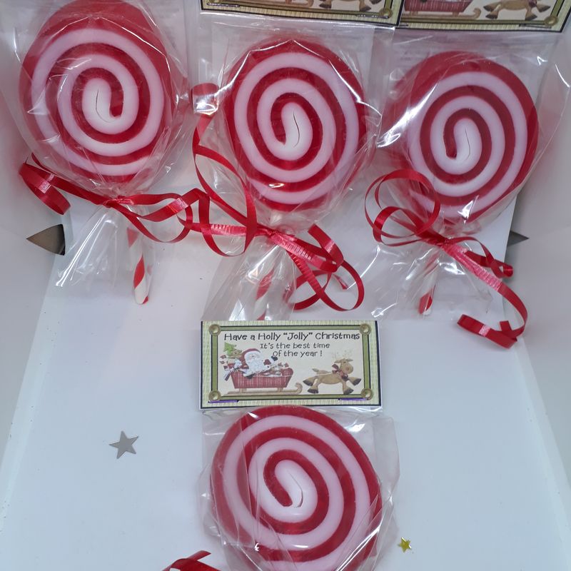 New In Ready For Christmas 🎅🎄 Candy swirl soap Lollys peppermint Fragrance I love these they smell amazing 💖 Have a Holly Jolly Christmas 🎄🎅 With these peppermint fragranced candy cane soap lollies, beautifully packaged Ideal stocking filler/gift. My Soap lollies are extremely popular and easy to slip off the stick and use .