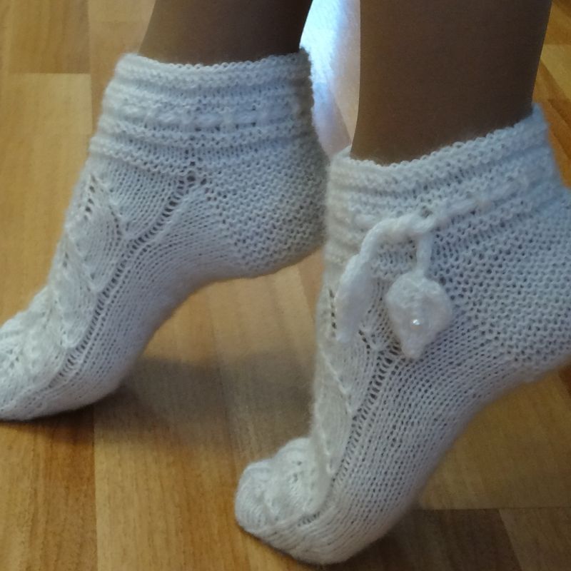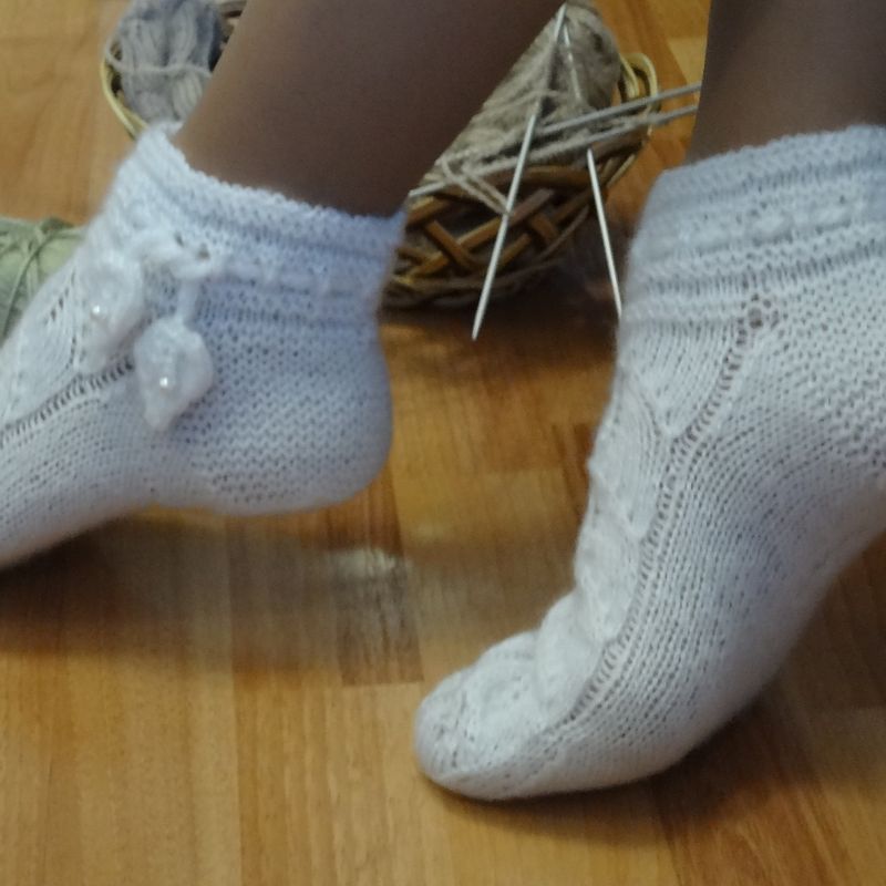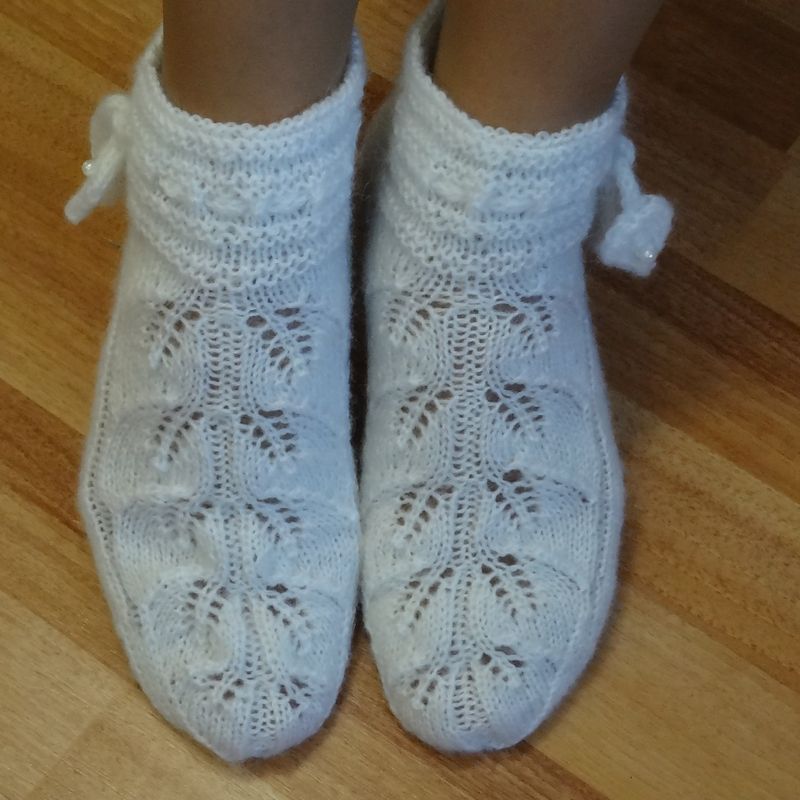You have a feeling of holiday when wearing these socks! They are white, elegant, with a sprig of foliage. You immediately want to wear your beautiful home clothes, sit in a comfortable chair, and pour your favorite hot chocolate in a white mug just to experience the bliss of the moment ... These shortened fancy socks that will warm your feet are made of semi-woolen yarn. They are weightless, so light! Beautiful snow-white ligature from the leaves goes down your foot. The top of the socks is decorated with a knitted cord with leaves, pearl beads are glistening. The cord tightly fits your foot. The socks can be customized. If you have any preferences regarding the colours or yarn, just let me know. These knitted socks can also be a part of your home outfit, or a good gift for knitted slippers lovers. Yarn: 40% wool, 60% acryl. Care instructions: hand wash only, dry flat. Size: 8, but can be customized. The socks have been knitted in the place free of tobacco smoke.