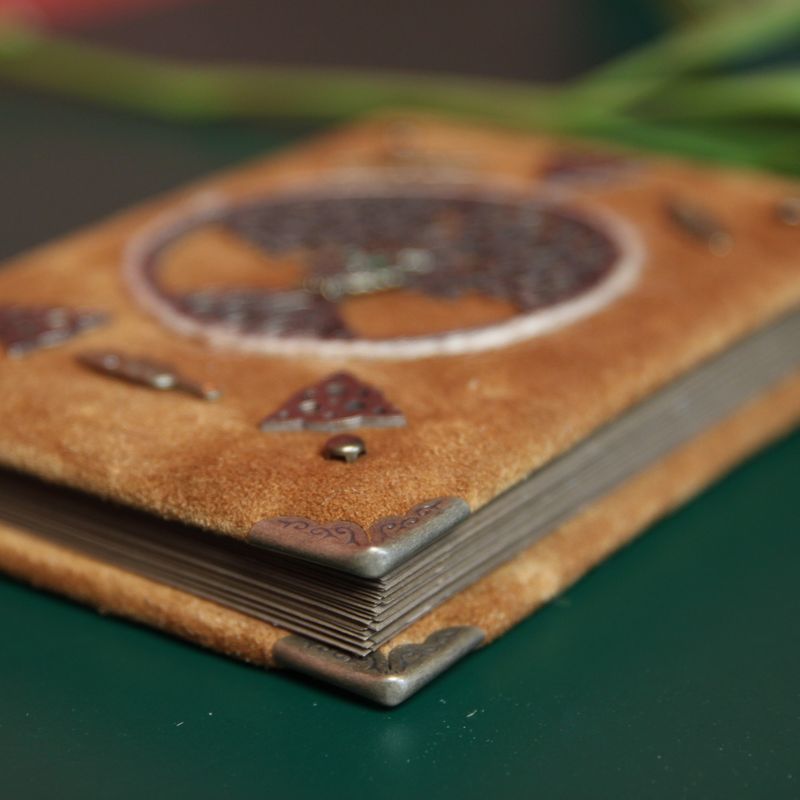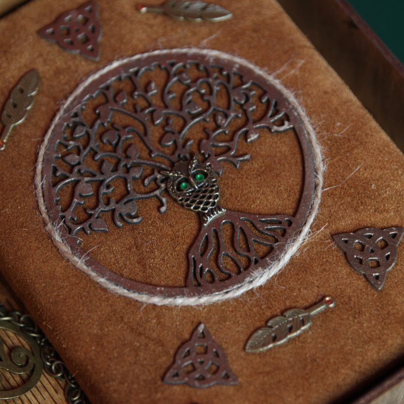 Handy and stylish, our cute journal is the perfect accessory to keep your notes organized. This “Brown Owl” notebook in Celtic style was made by hand with great attention to detail and quality. The front cover is made of real suede and decorated with metallic Triquetra, Tree of life and Magic Owl Symbols in the center. What do these symbols mean? Triquetra - is the symbol of destiny, power, strength, wisdom, leadership, and endurance. The Tree of Life is a symbol of balance and harmony. And the Owl associates with intelligence, brilliance, power, and knowledge. This bird has a gift of heightened senses which enables it to see through deception, illusion, external appearances and to find hidden truths. Please note: Pages are fixed by hand. It’s 100% handmade item. Each notebook comes in a wooden box and has a bookmark. Brown Owl notebook from Crafting For You Studio is a great way to show off your personal style and keep the important notes and appointments all at once. Perfectly sized (approximately 14x18 cm) to carry in a handbag. You can also create your own set of memories, collecting our notebooks. It looks very noble. Functionality: • 200 pages (100 sheets) of craft paper • Size: approximately 135 x 180 mm • Comes with natural wooden box