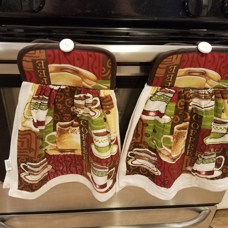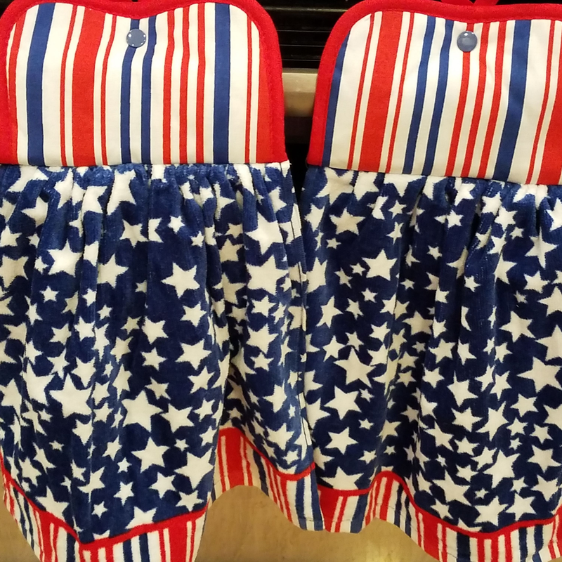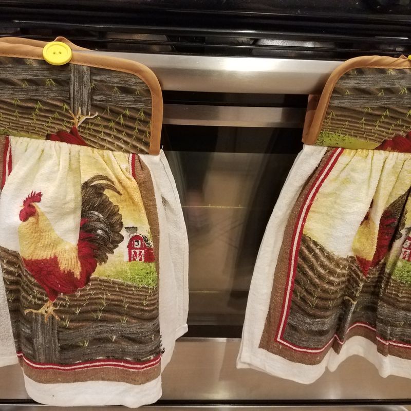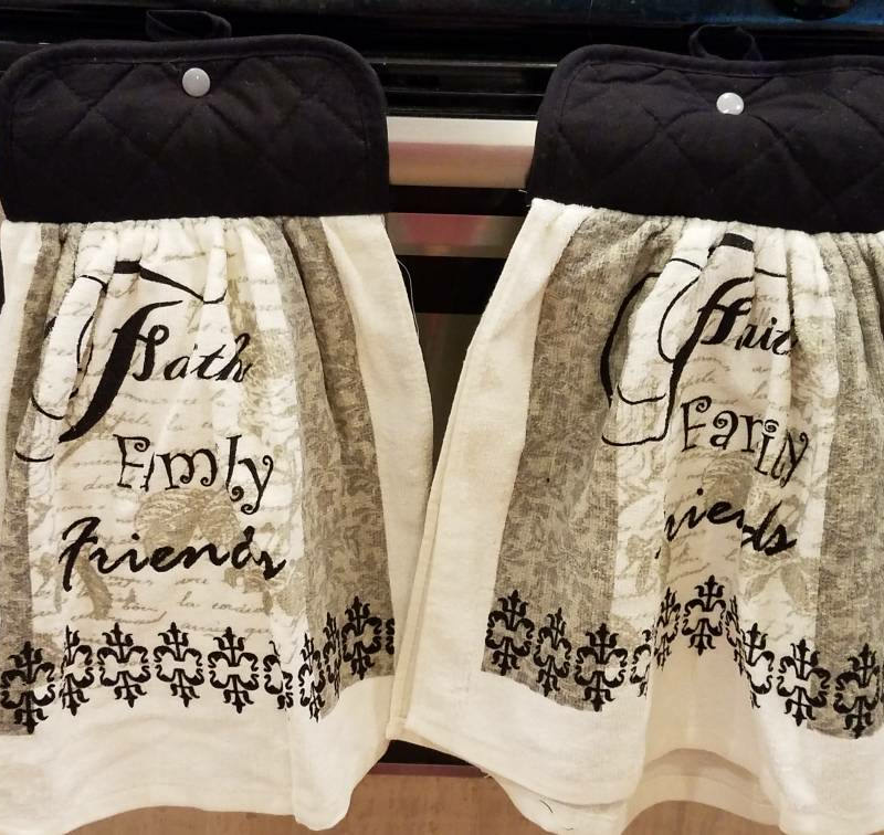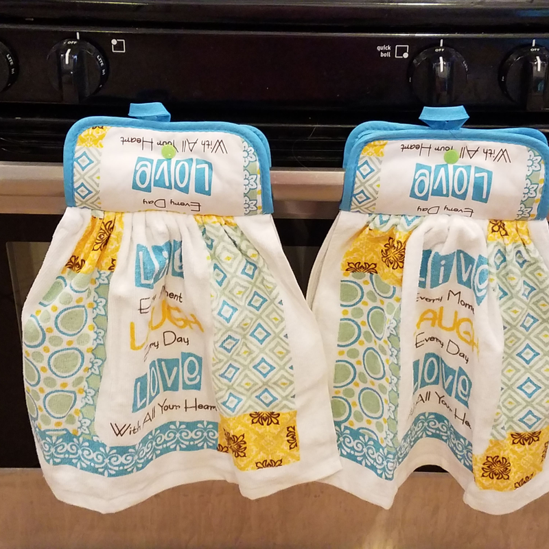 Hanging potholder towel sets. Potholders are sewn onto the towels creating a functional hanging potholder and towel combo. Comes as a set $10.00 plus shipping and handling.